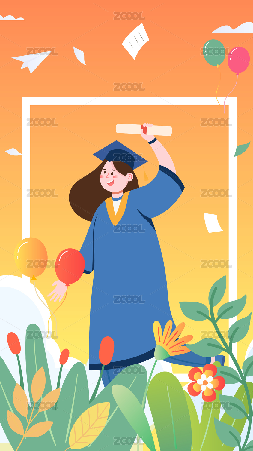 橙色黄色女孩毕业创意插画