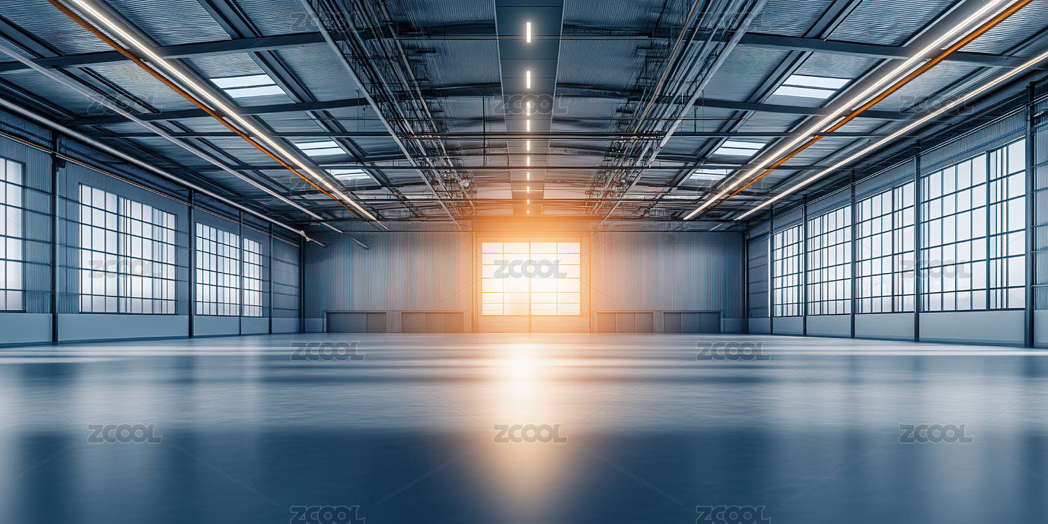 阳光下现代宽敞明亮的工厂仓库室内空间