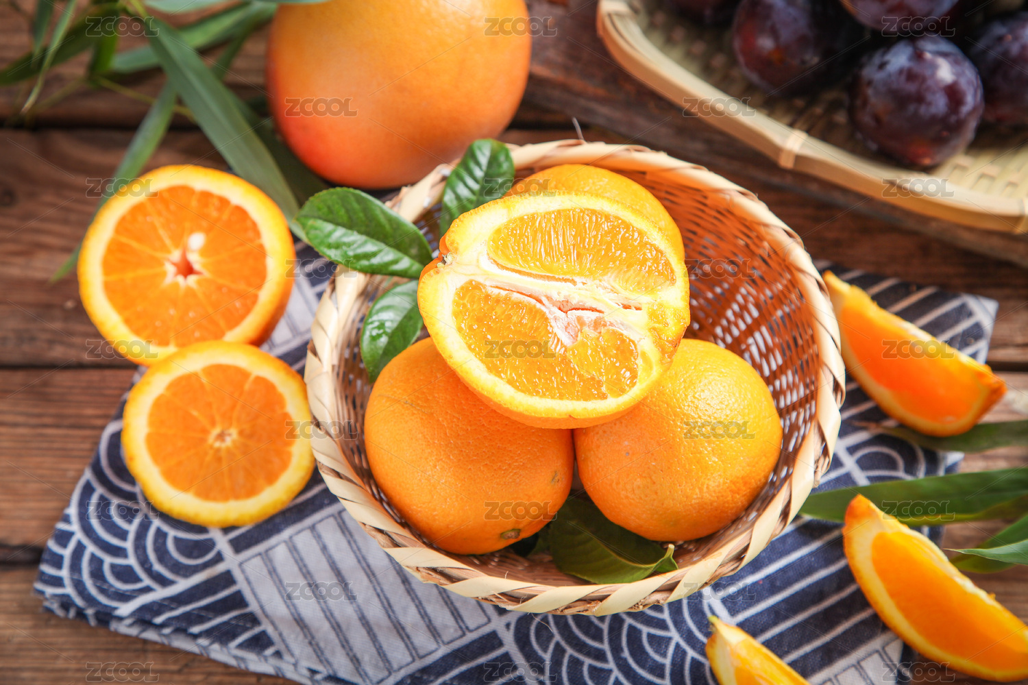 木桌上放在竹筐里的多个切开的雷波脐橙