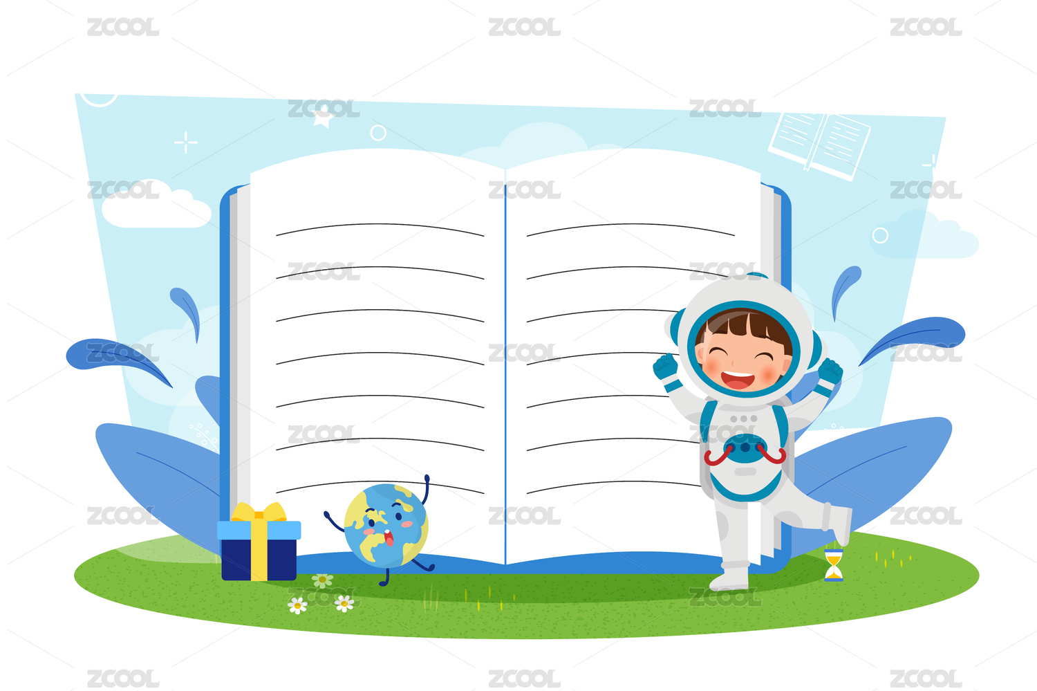 国际扫盲日男孩在太空中飞翔读书学习插画