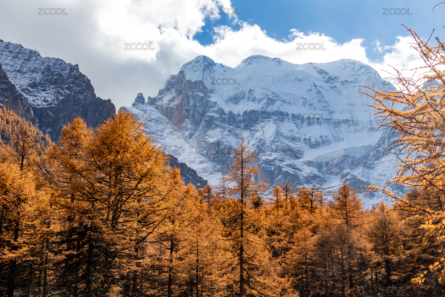 秋天冬天稻城亚丁黄色树林中的仙乃日雪山