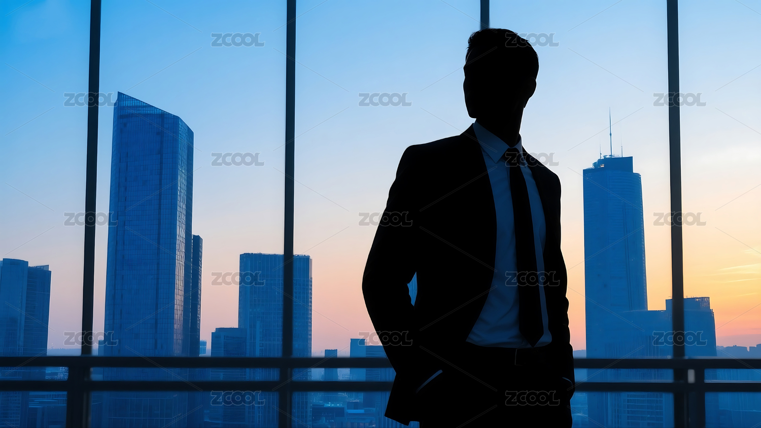 一位成功商业白领站在玻璃幕墙后边欣赏城市