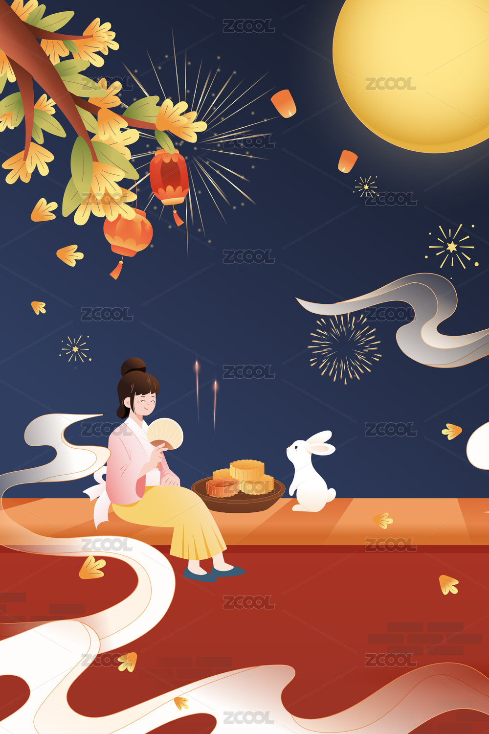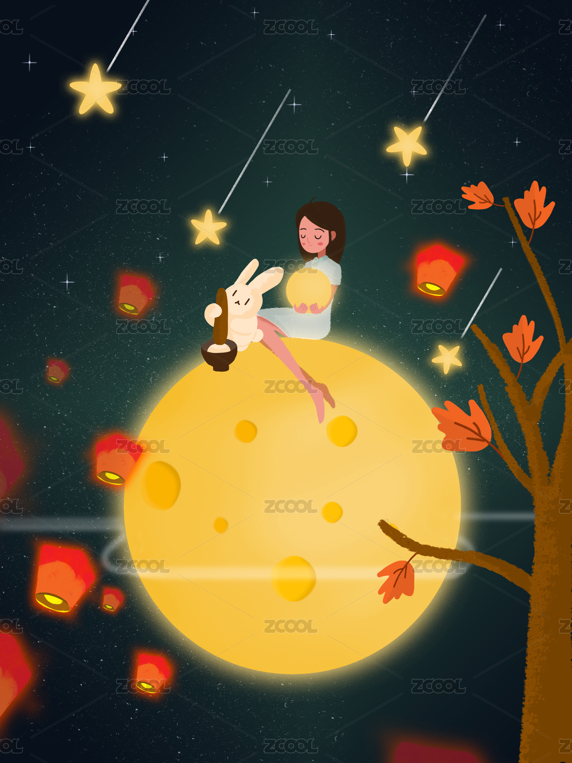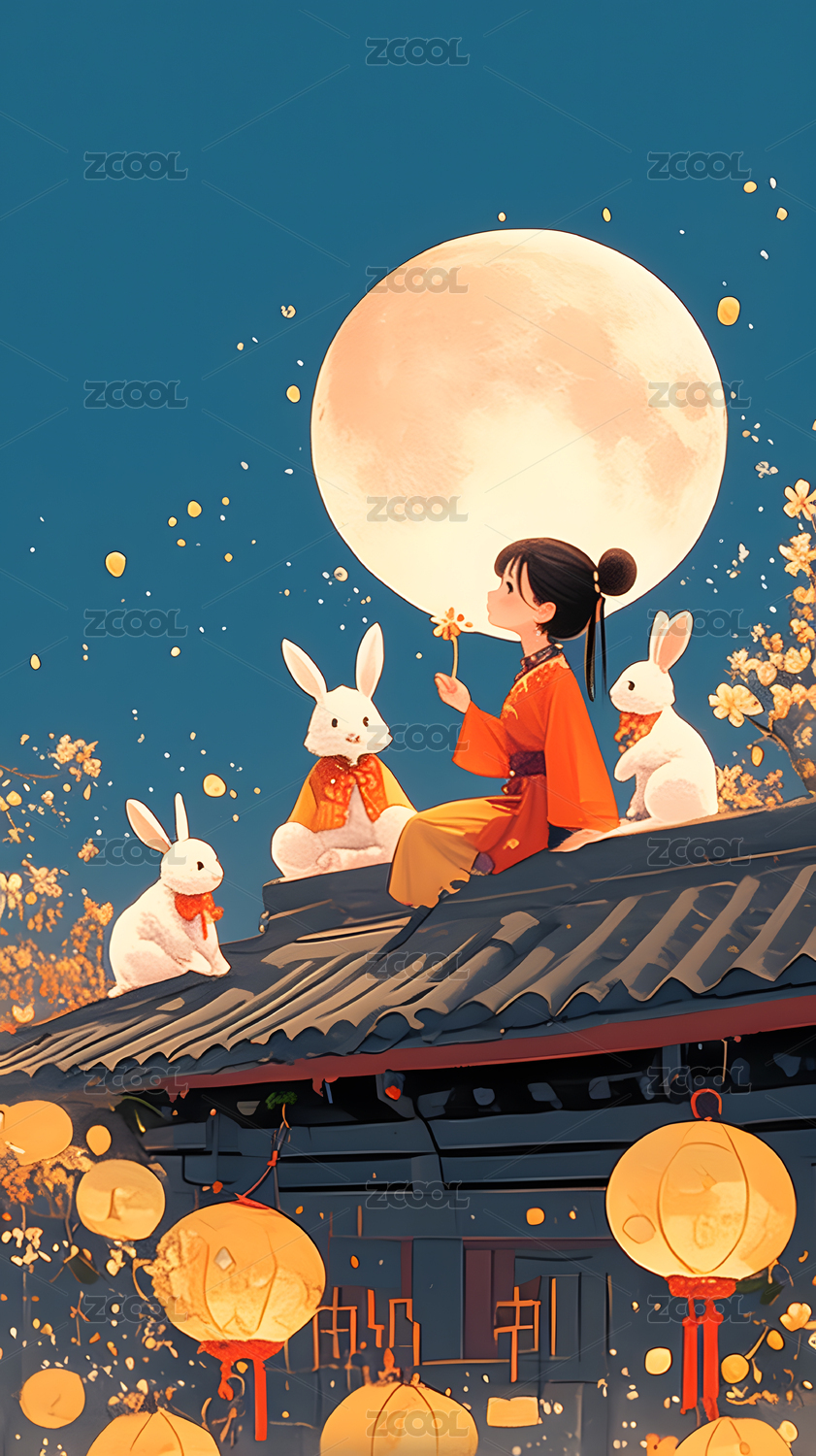 坐在月亮上的小女孩和兔子插画——中国传统节日中秋节