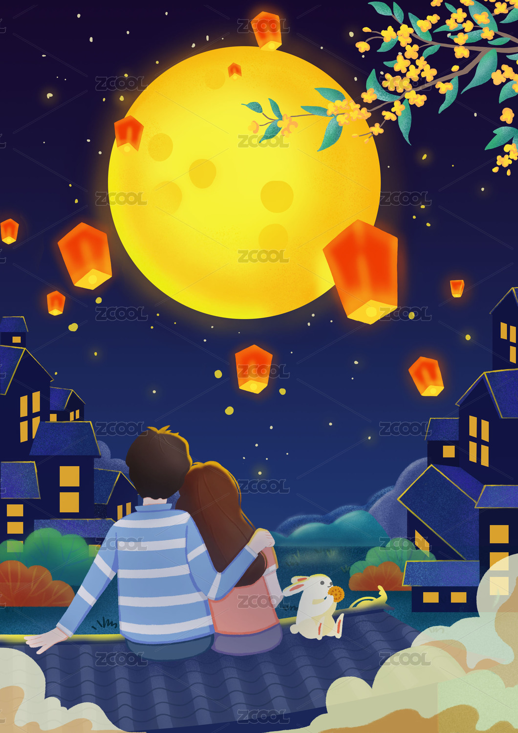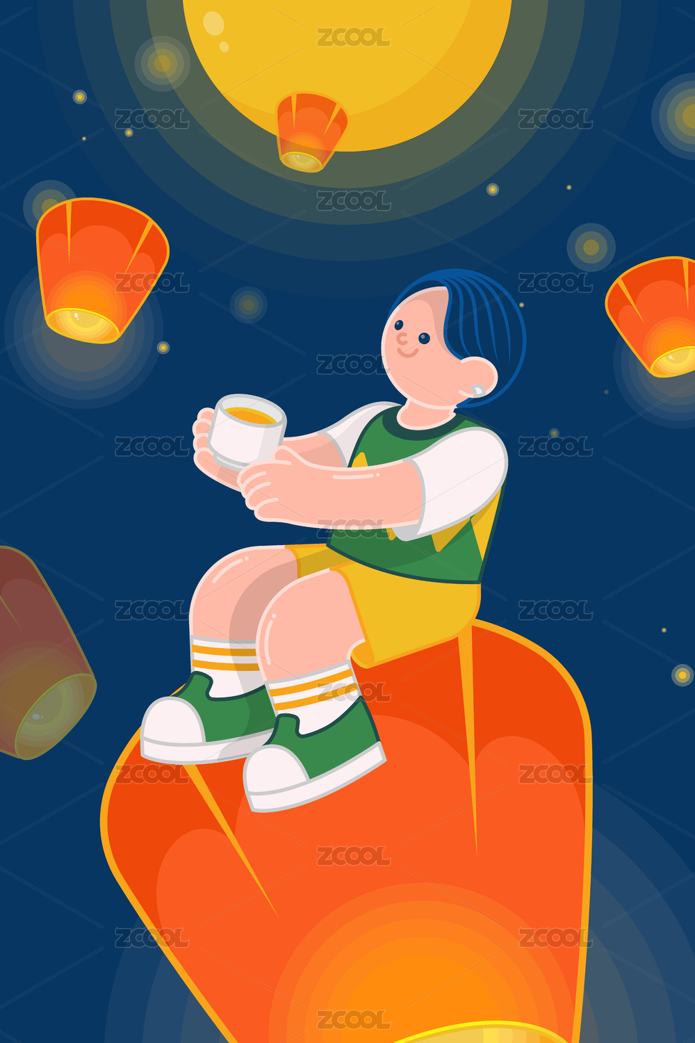 夜空明月照耀中孔明灯缓缓升起-节日插画