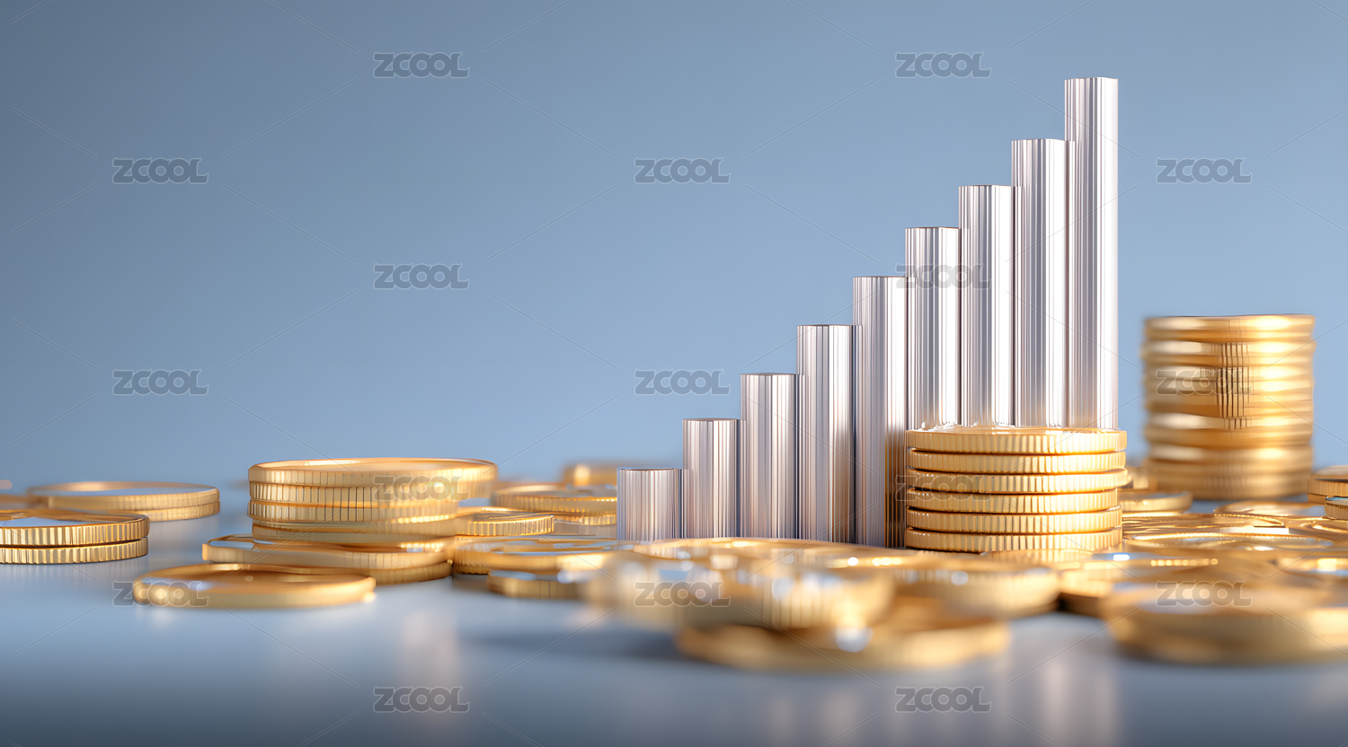 金币堆叠与透明柱状图展示经济增长