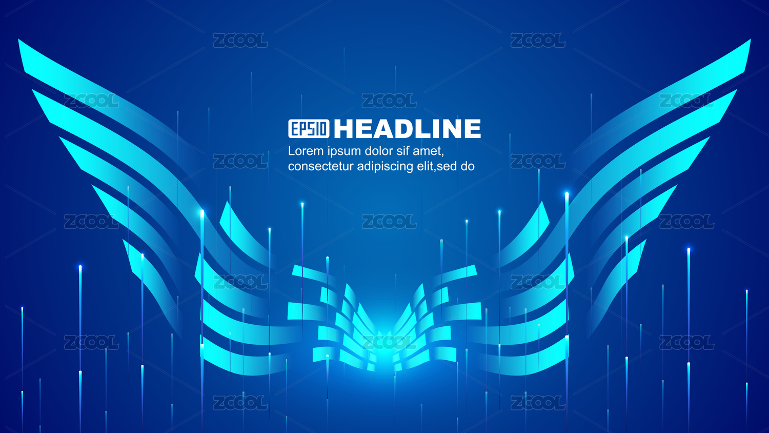 具有科技感蓝色飞翔翅膀与射线矢量海报背景