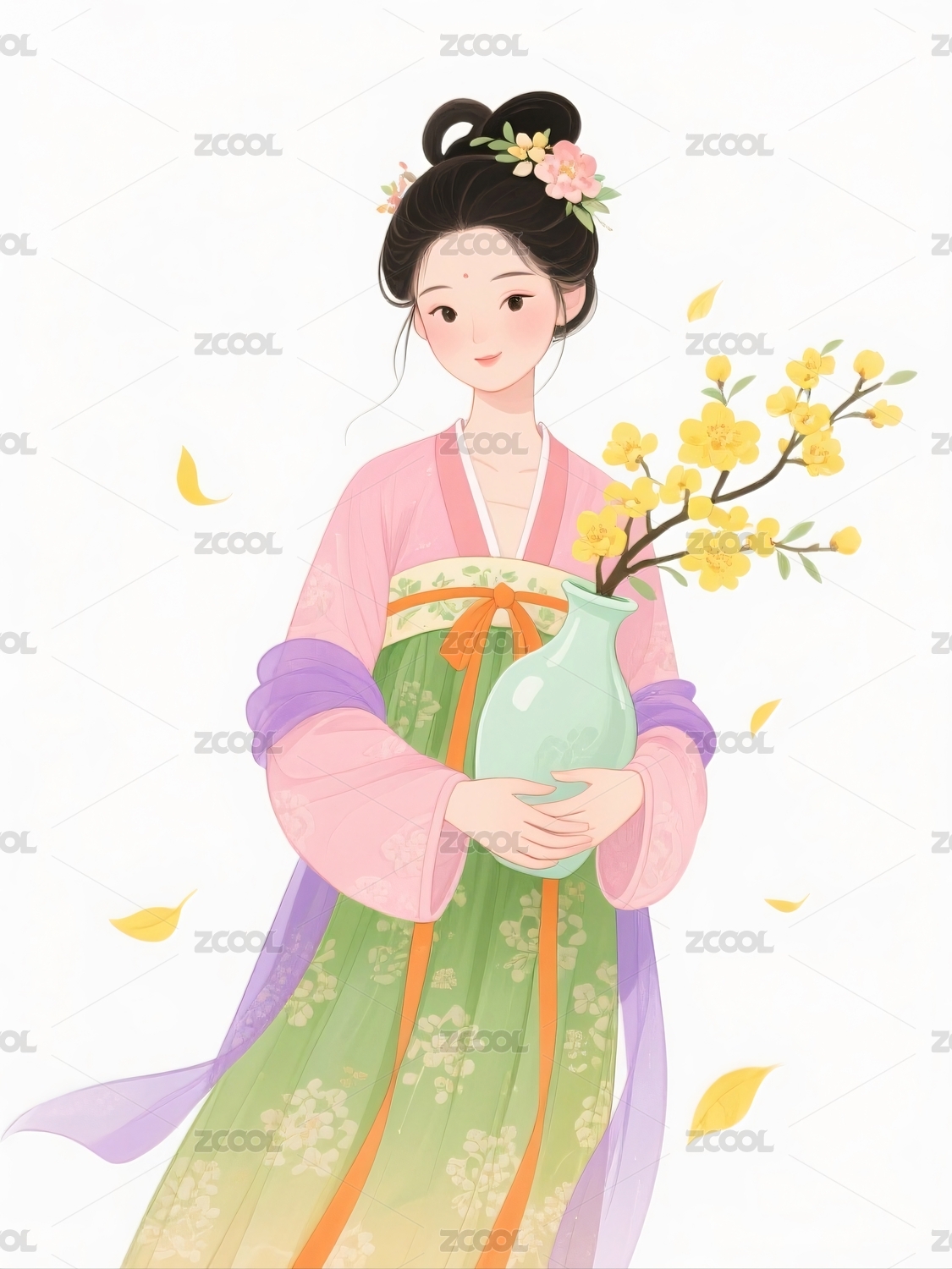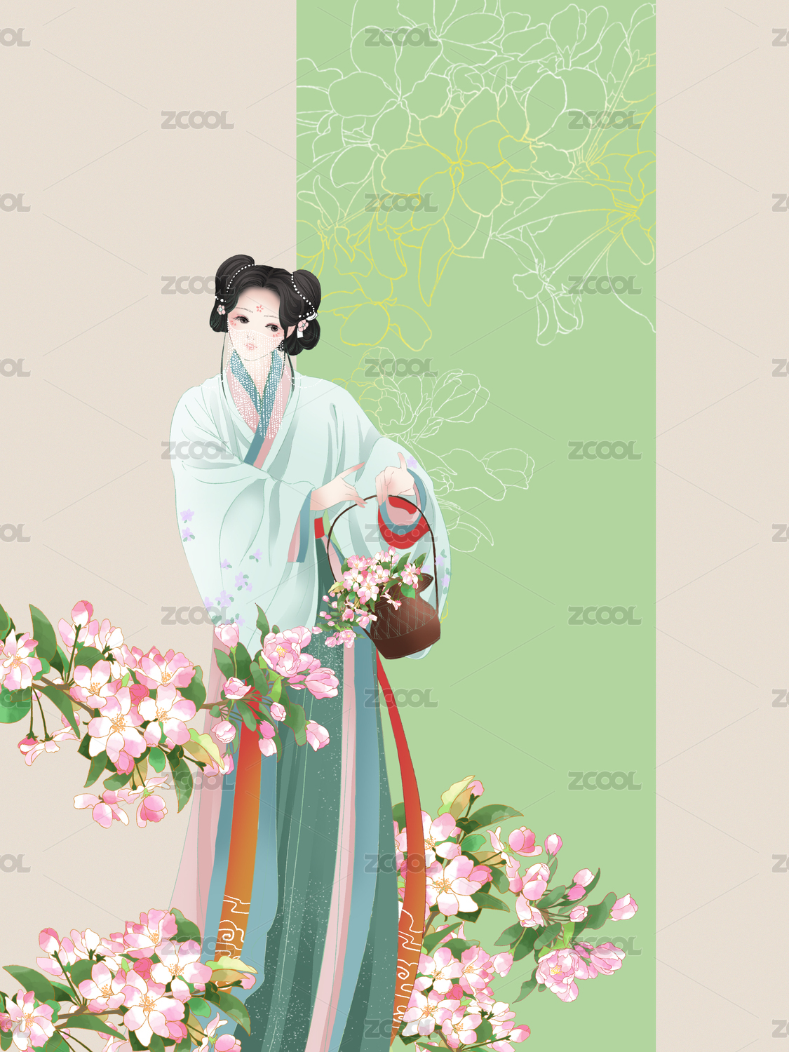 簪花仕女图之拿着花篮戴着面纱的海棠花少女