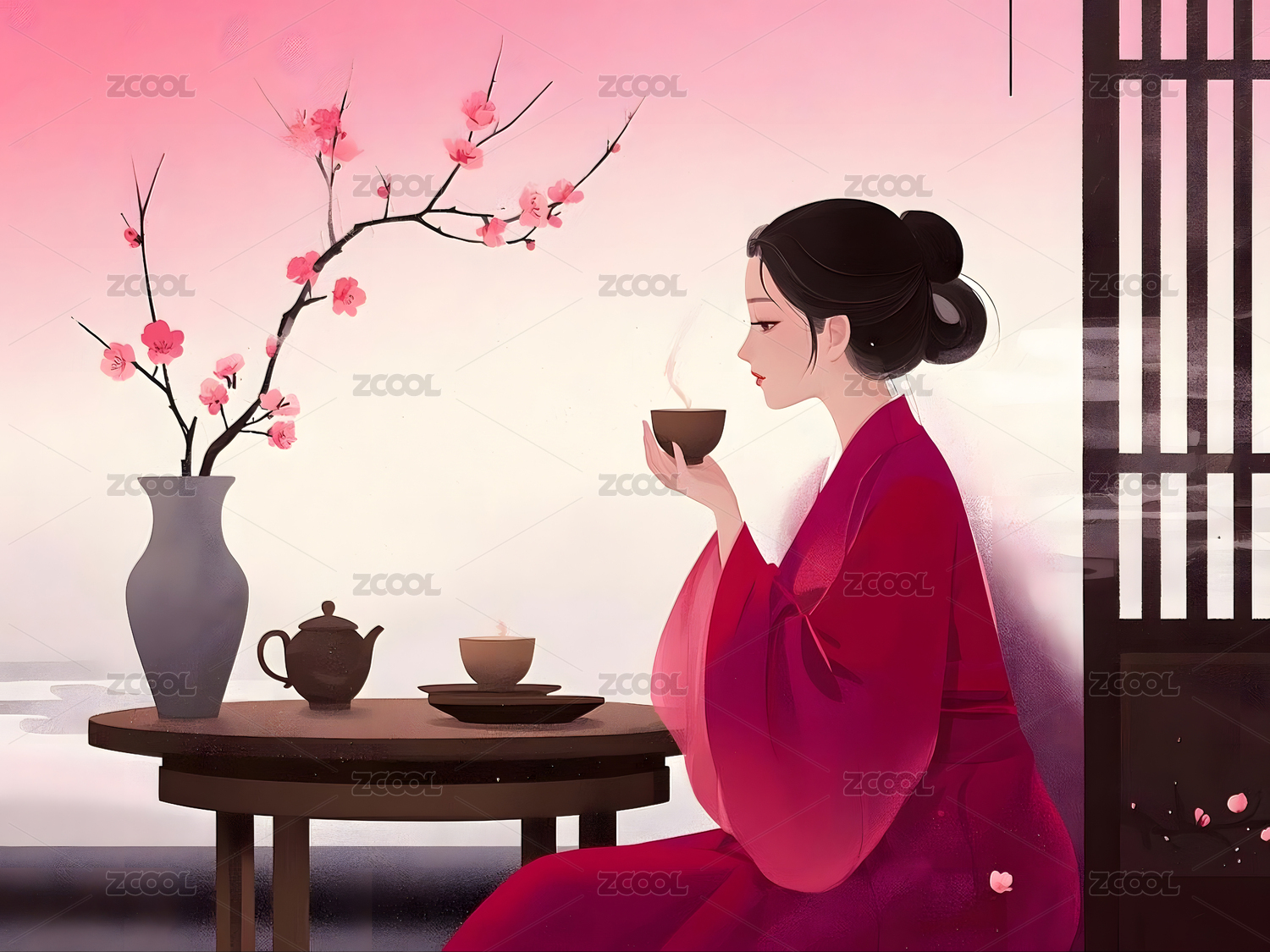唐朝,春天,插画,国潮风,中国风,仕女,桃花,花窗,二十四节气,节气