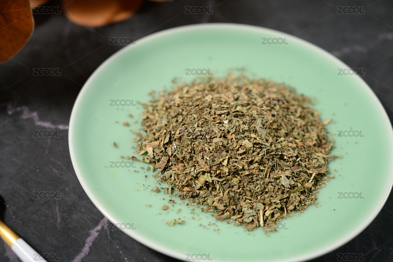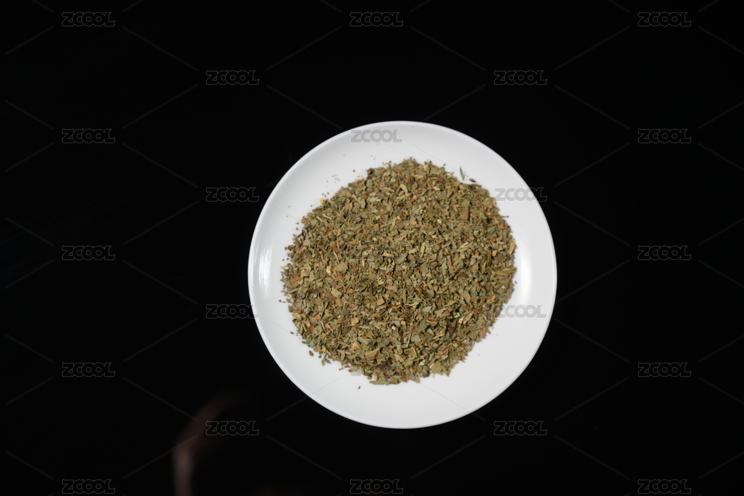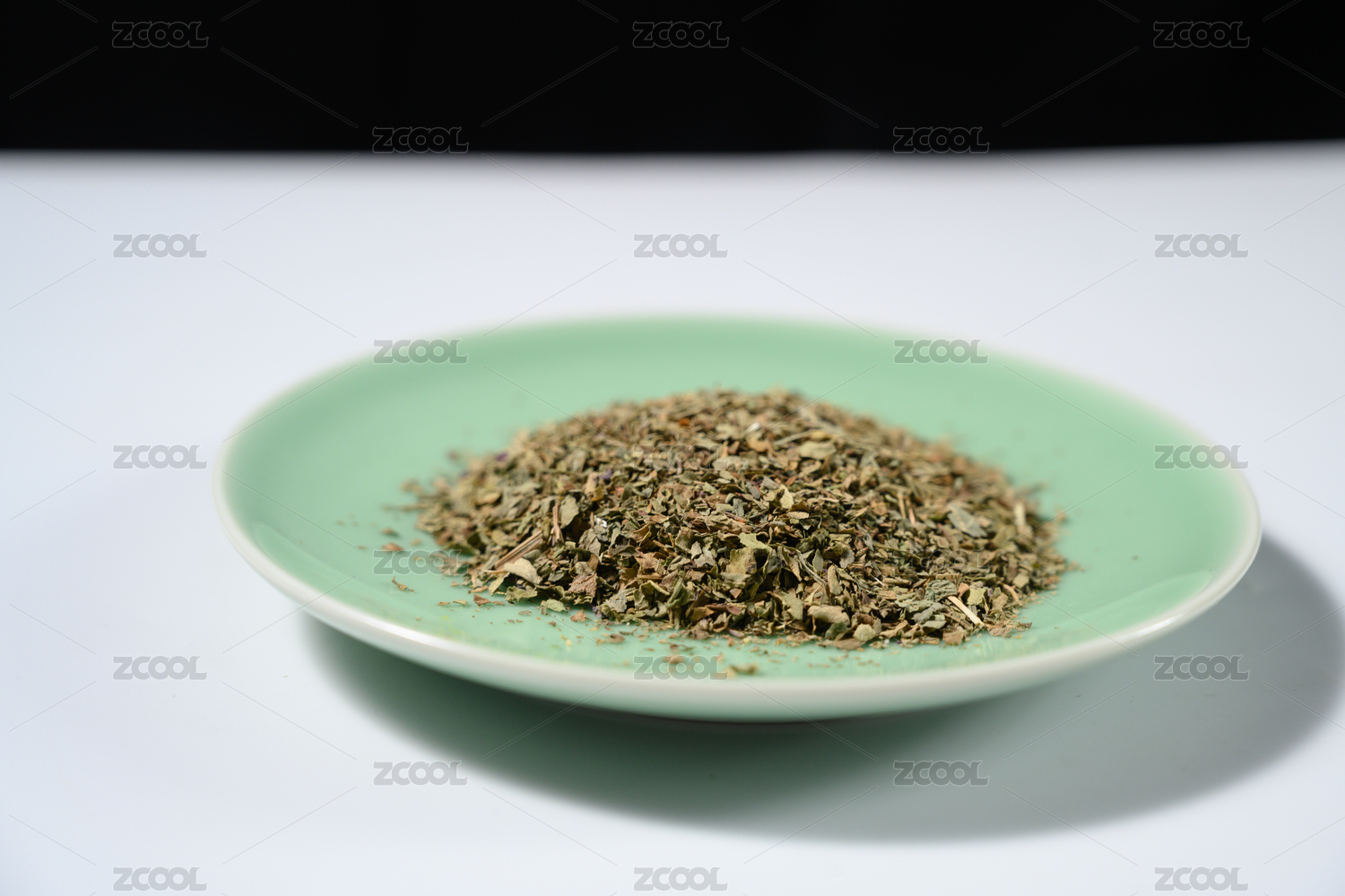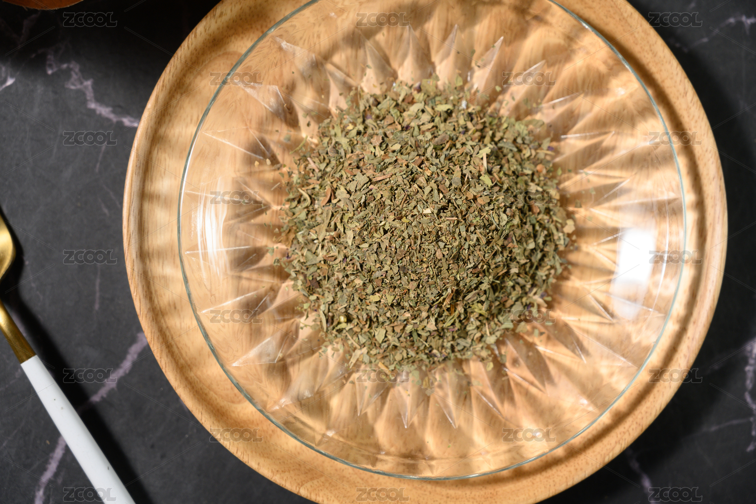 桌面上的盘子里的干爽且香气四溢的罗勒香料