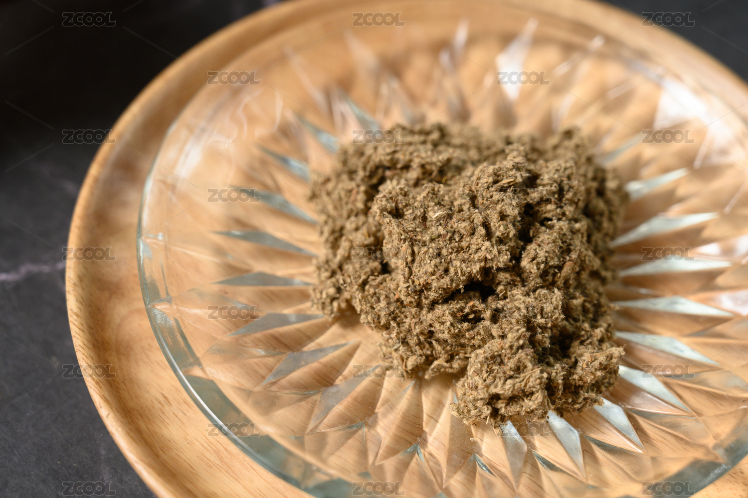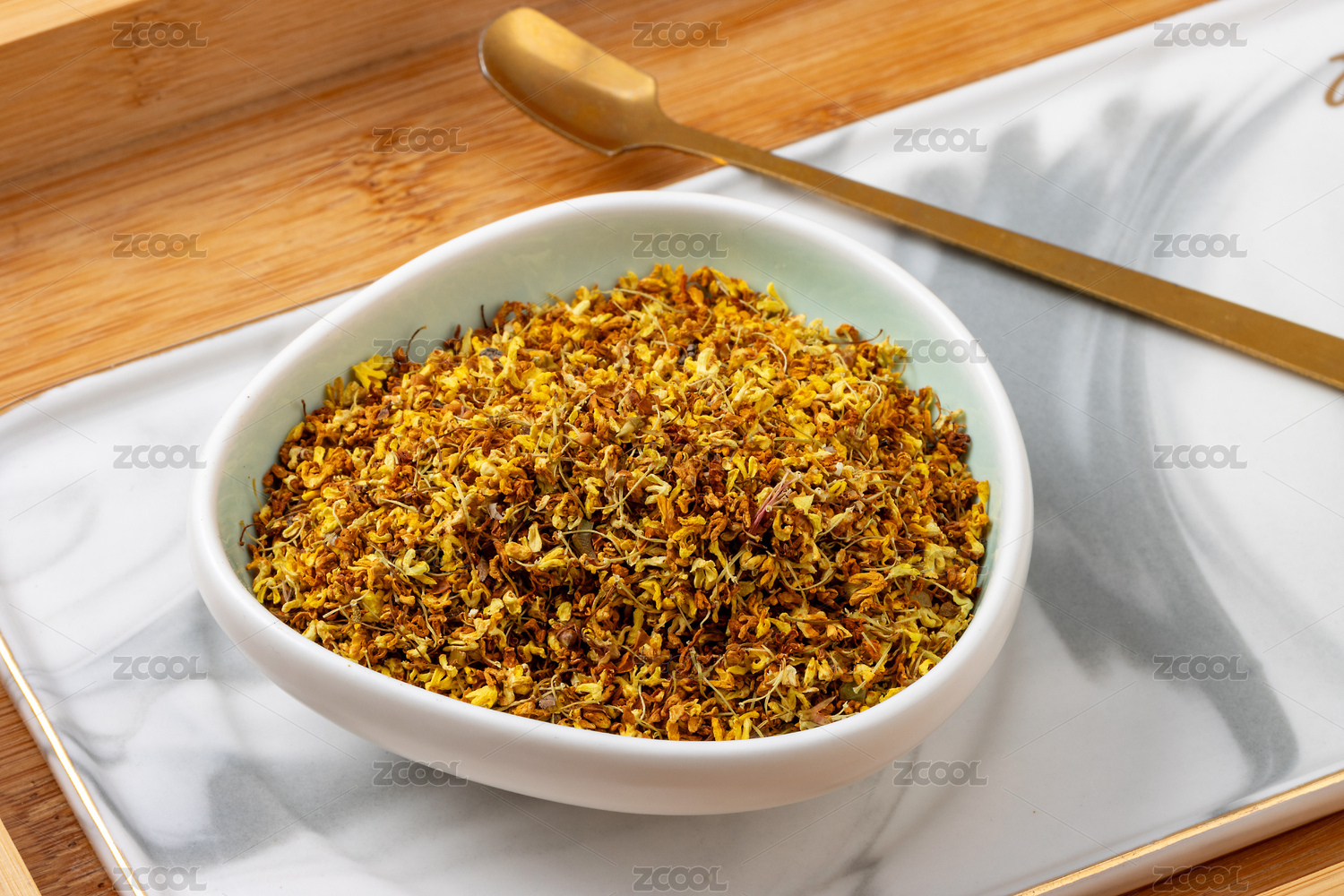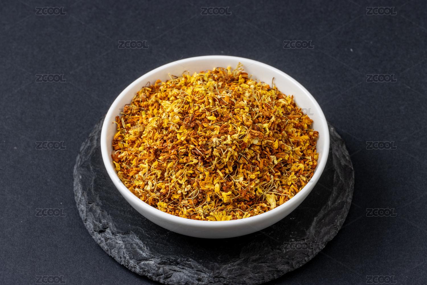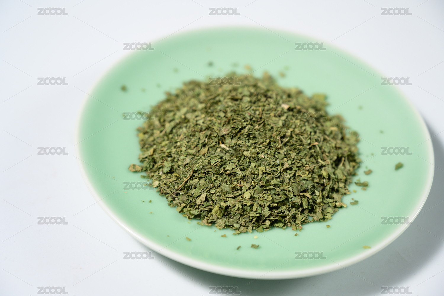 桌面上的盘子里的干爽且香气四溢的罗勒香料