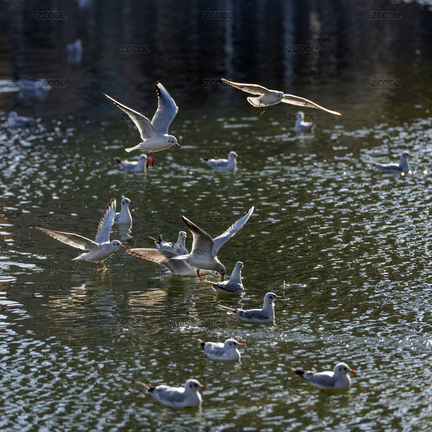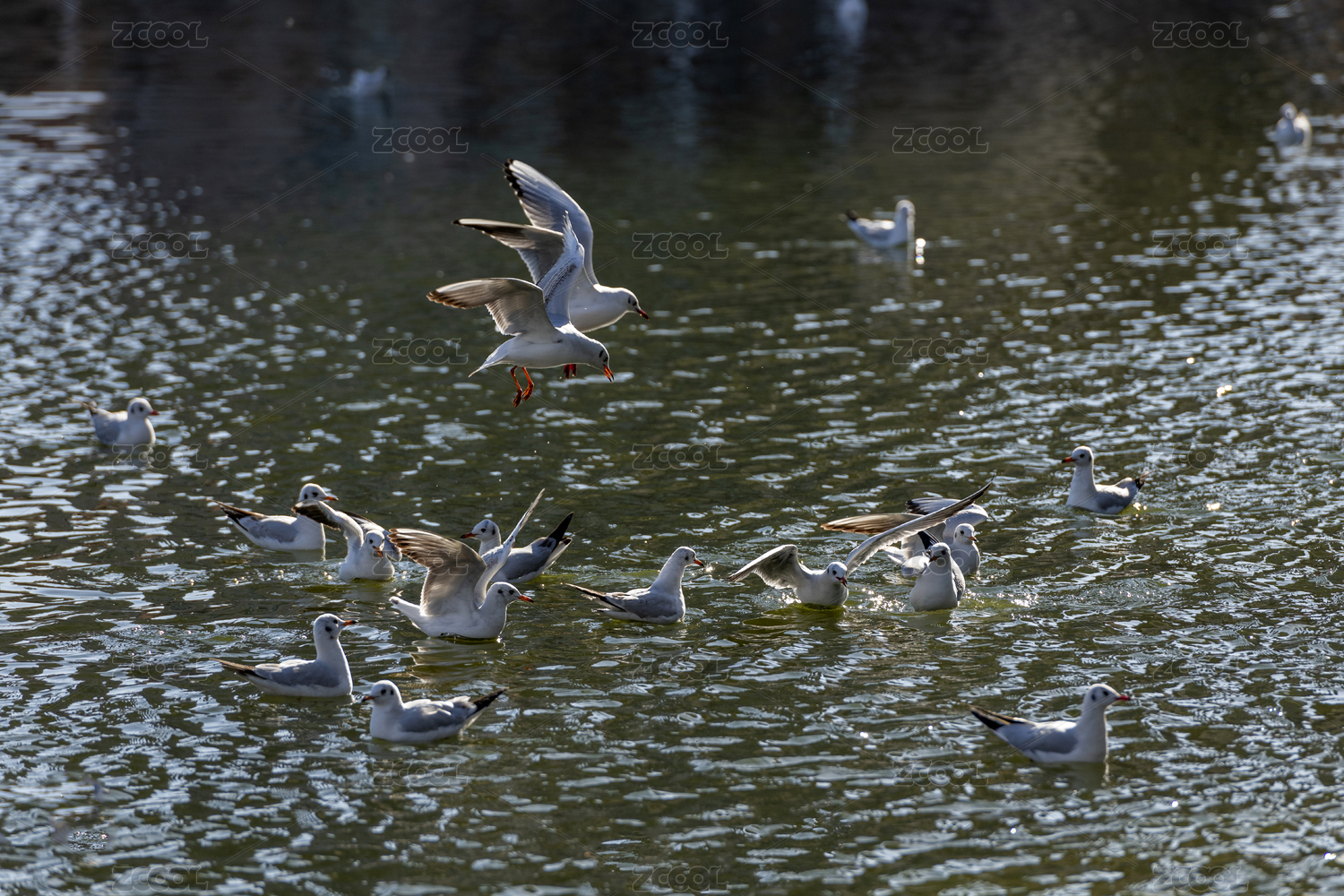 红嘴海鸥在水面上自由飞翔追逐觅食嬉戏