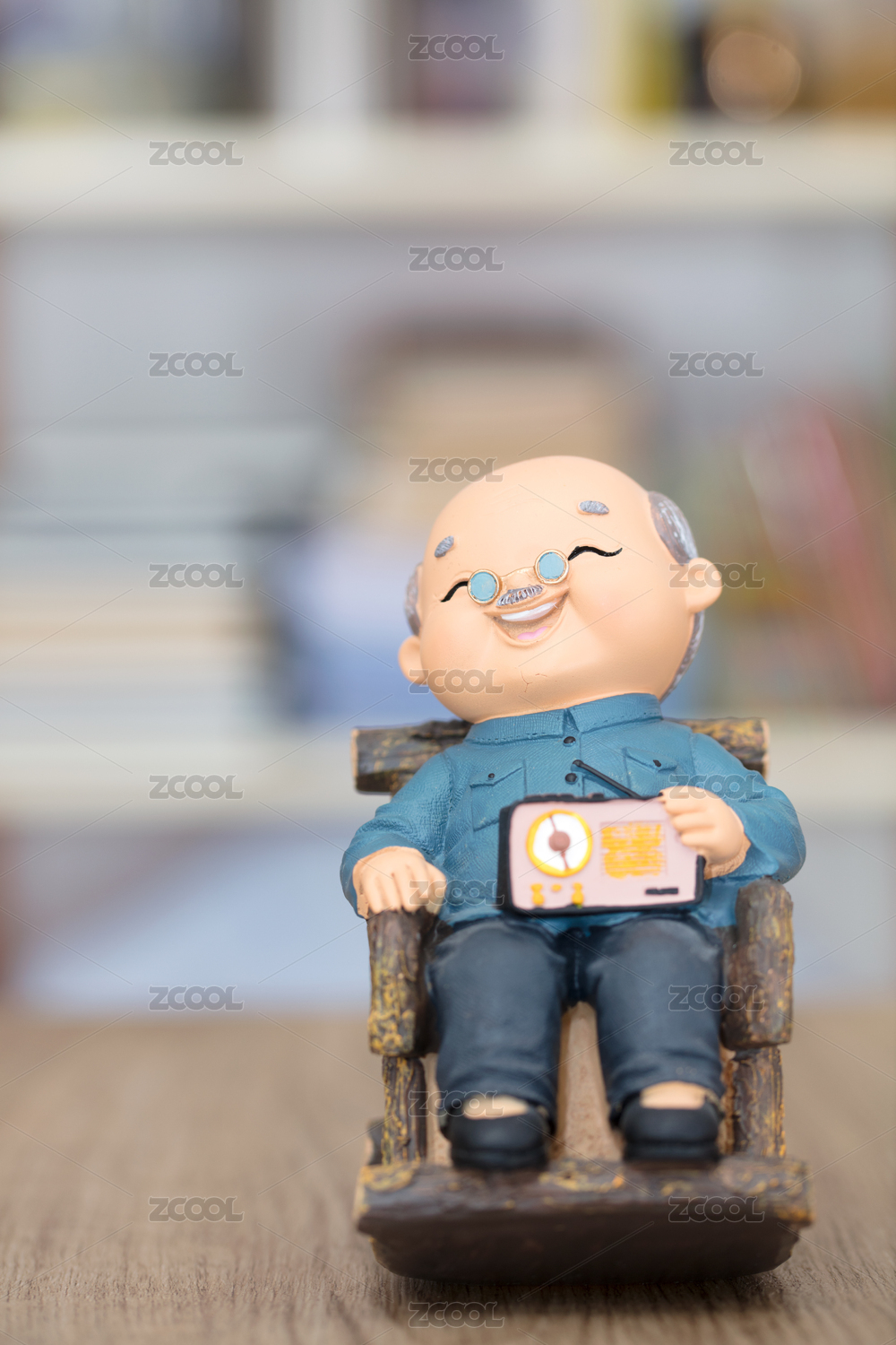 虚化的绿植背景前一个坐着摇椅乐呵呵的享受养老生活的老爷爷雕塑