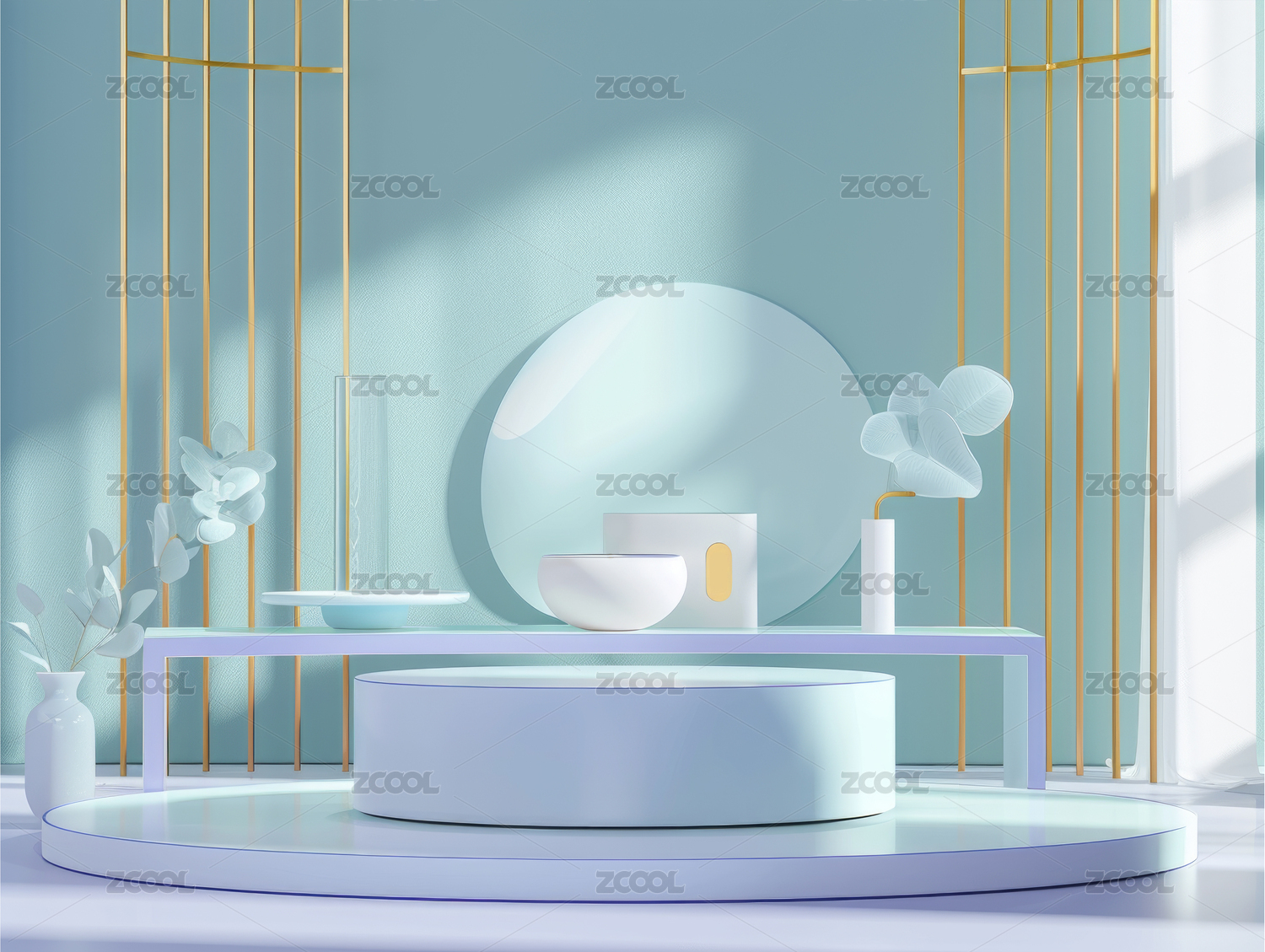 粉绿调几何陈列与绿植场景