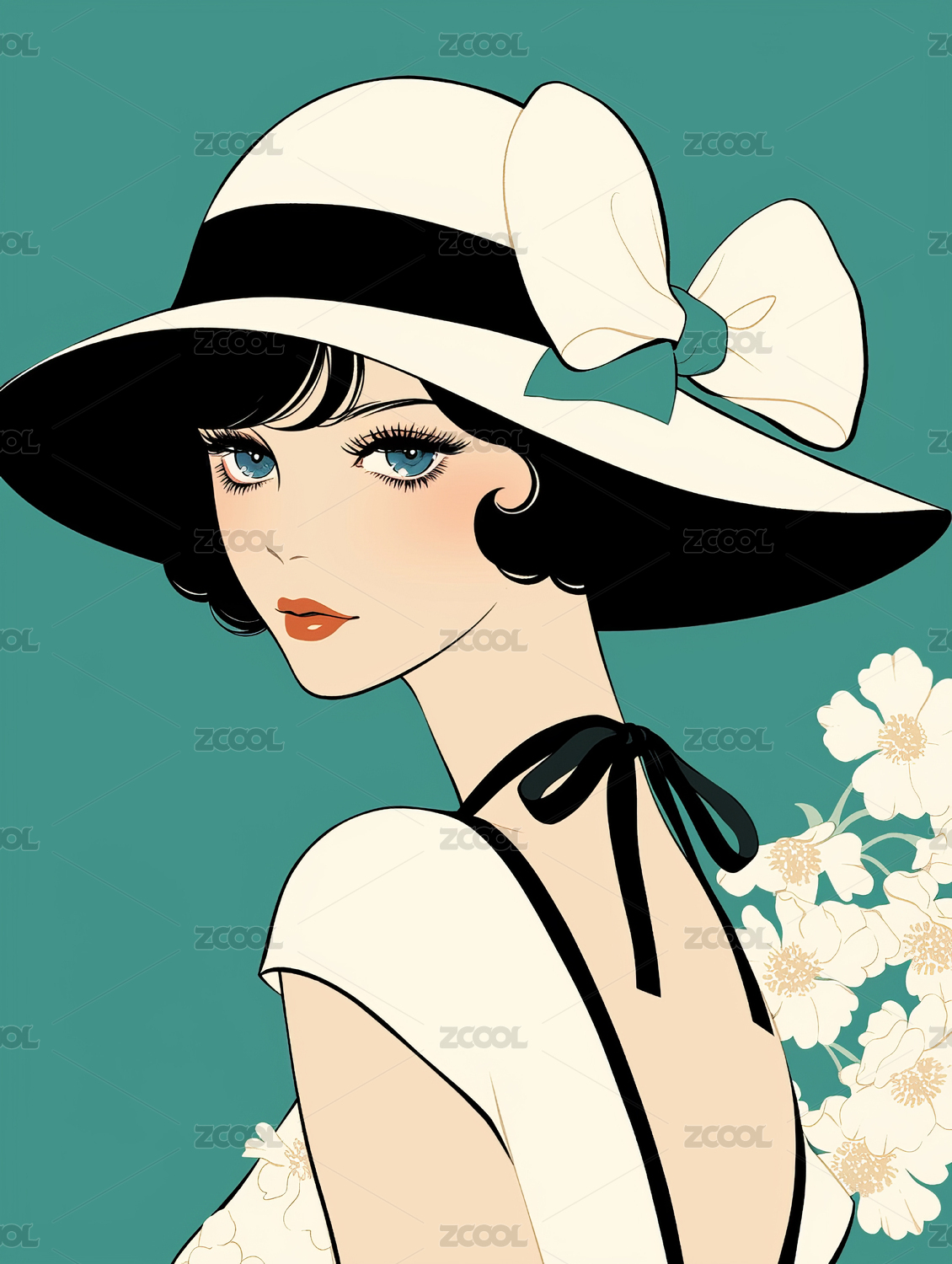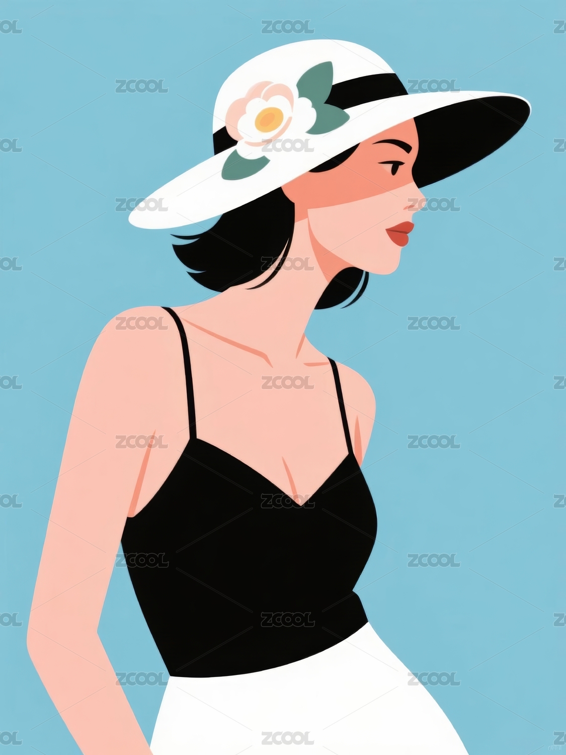 女人,插画,性感,知性,女性,耳环,美女,帽子,青色,裙子
