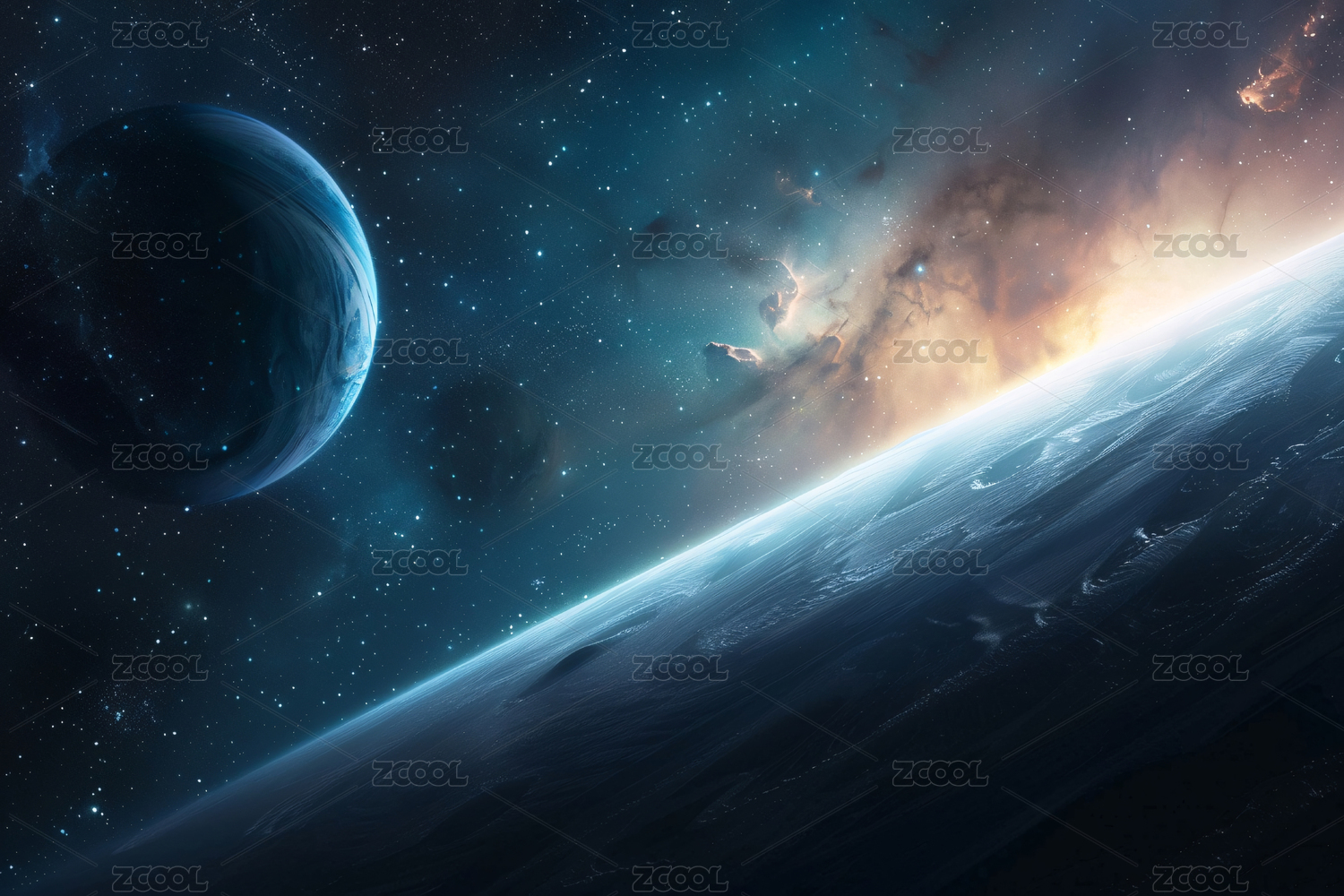 蓝色星球与卫星星云景色