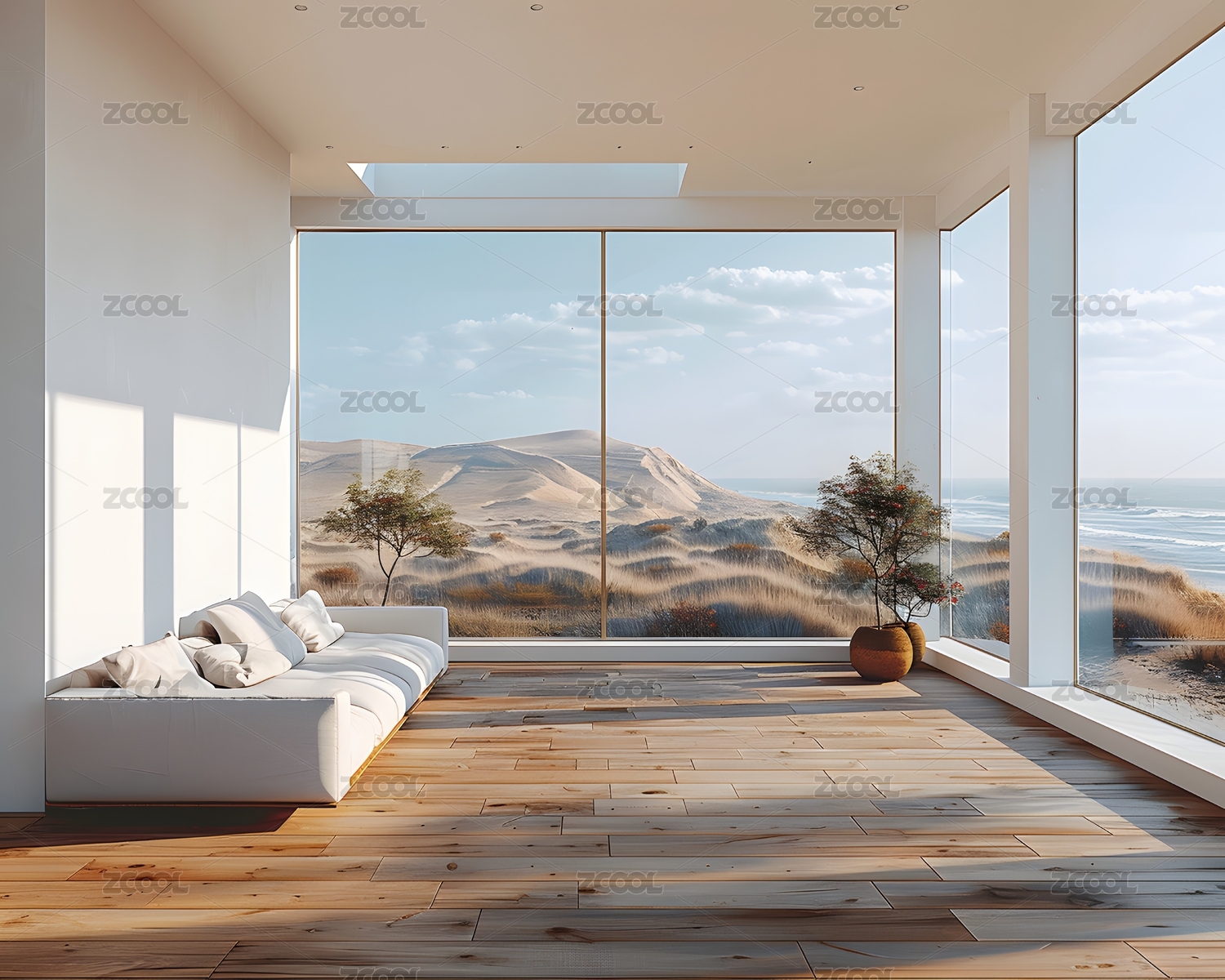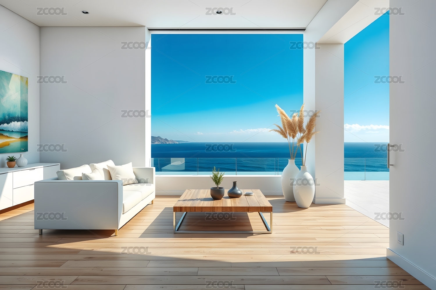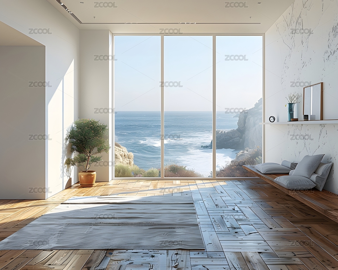 现代,室内,落地窗,海景,木质地板,白墙壁