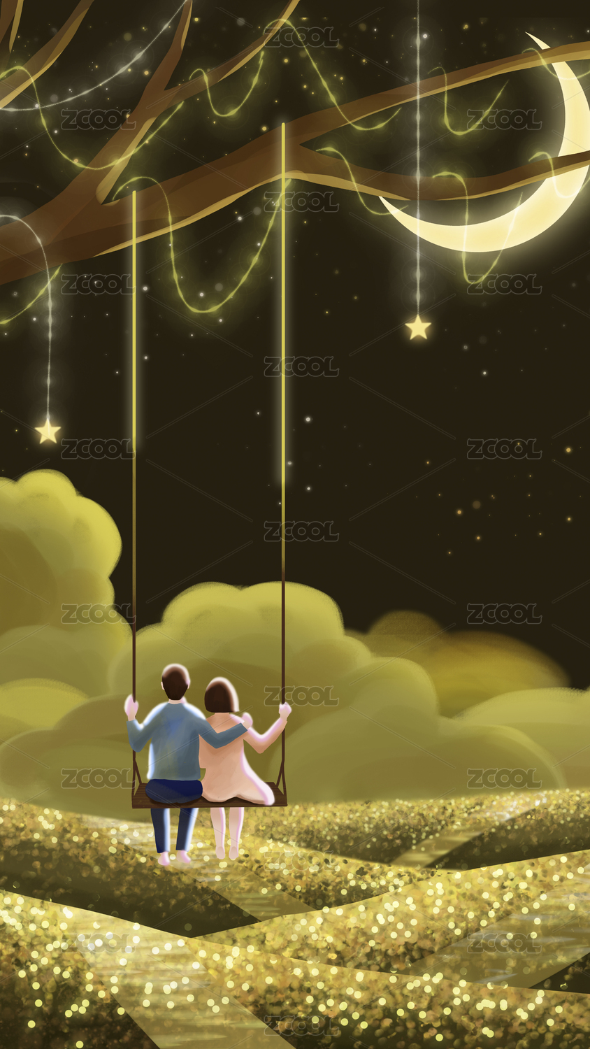 月亮星空下步行的青年情侣背影温馨梦幻手绘插画