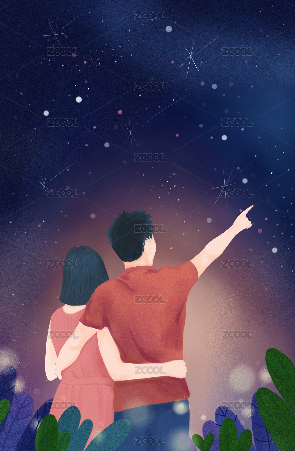 落满星星的星空下牵手的情侣手绘插画,月亮旁的情侣梦幻插画,情人节插画