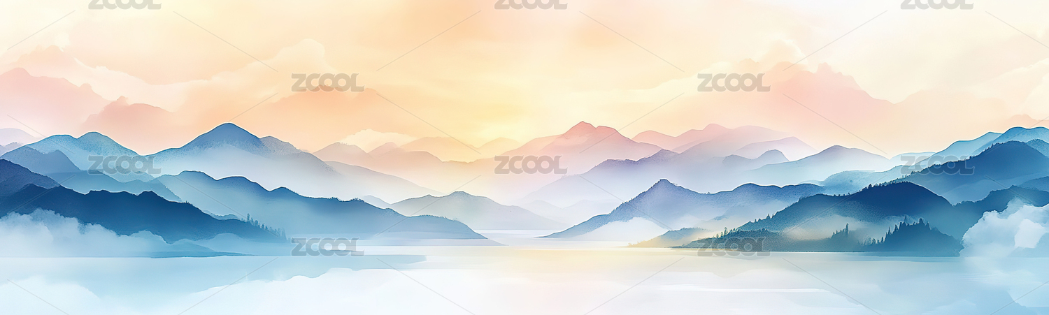 水彩风格山峦湖泊倒影风景绘画,静谧而悠远