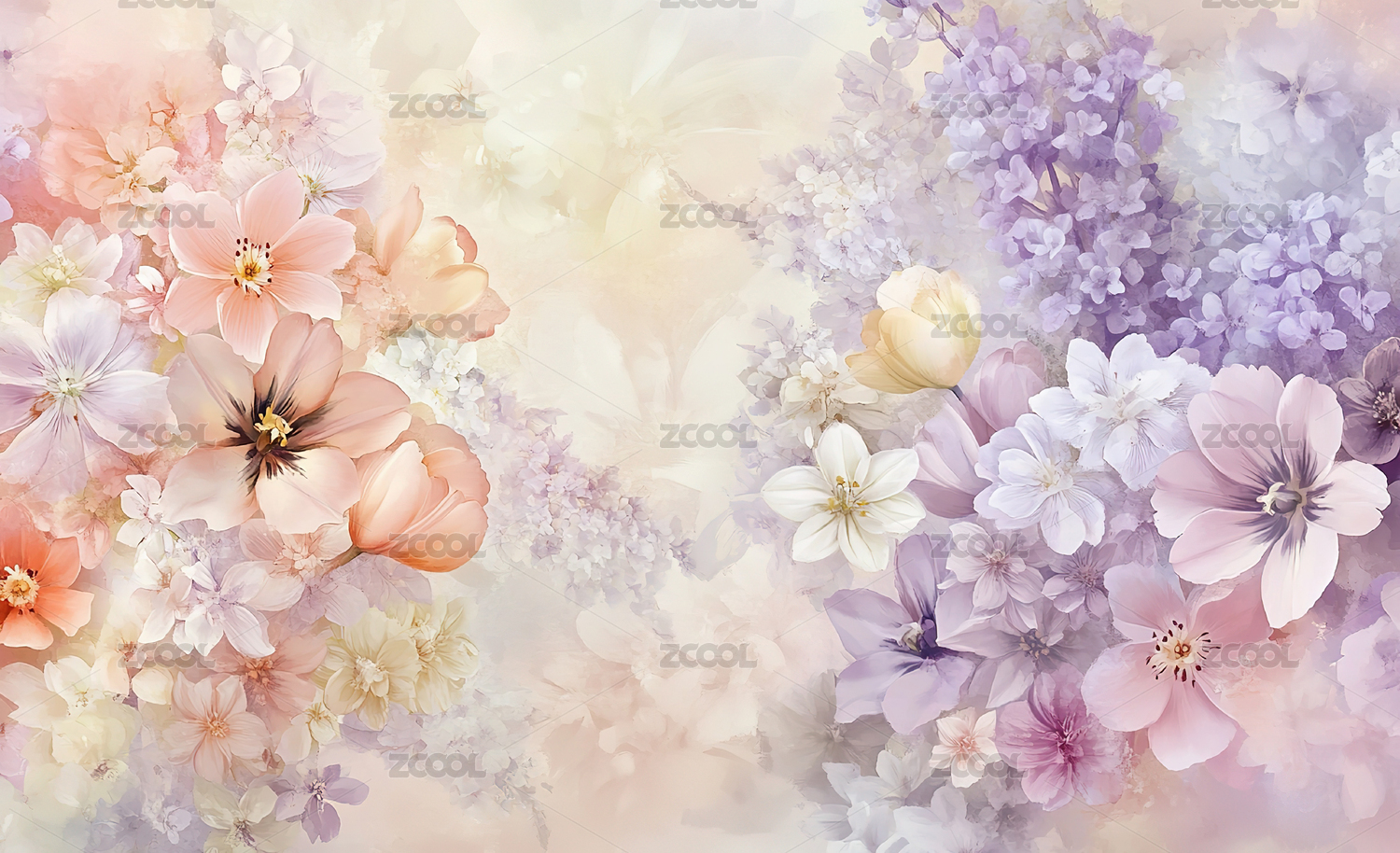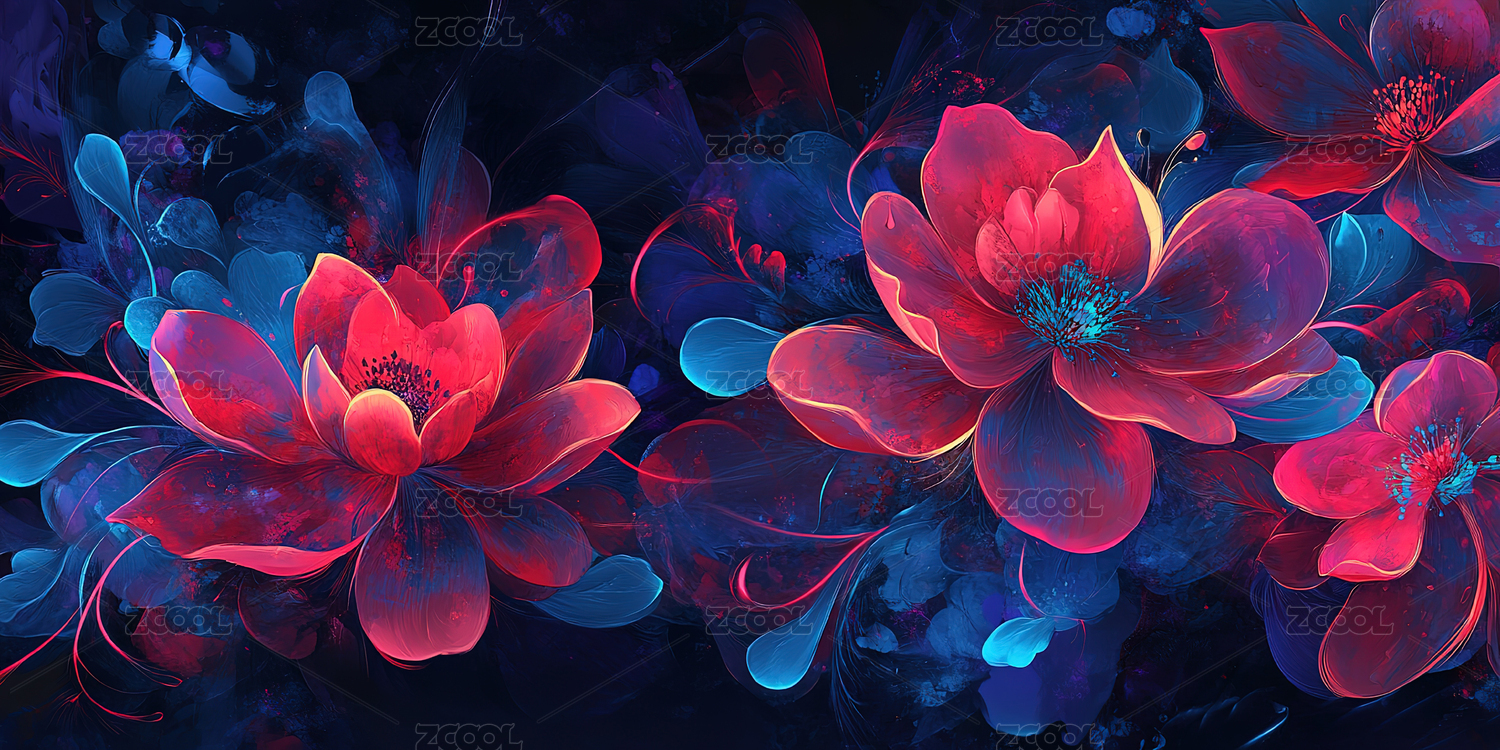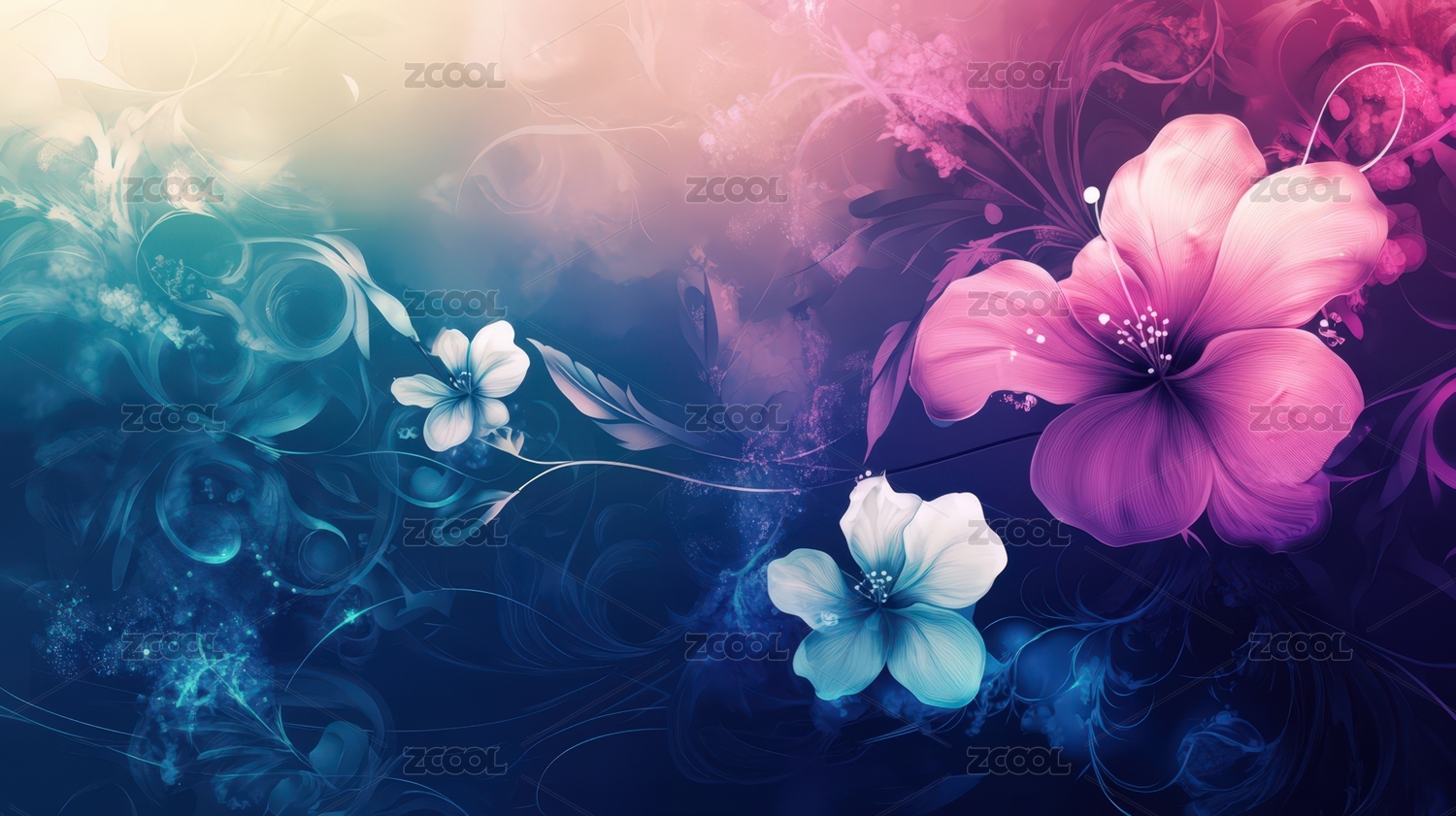 粉红色花卉在蓝色叶片中的小清新简约插画