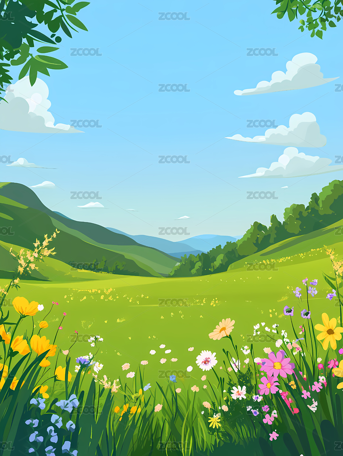宁静的绿山和花朵