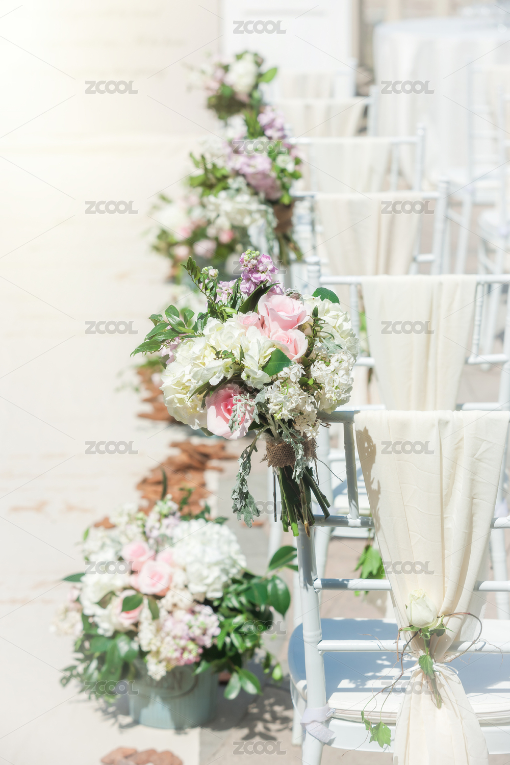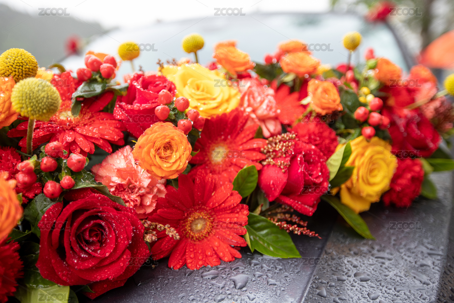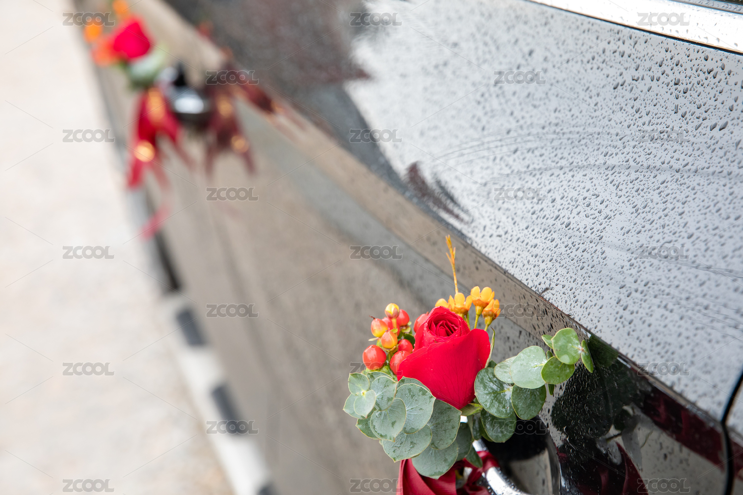 用美丽的玫瑰鲜花装饰的婚车局部特写