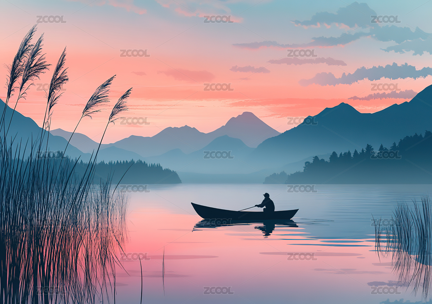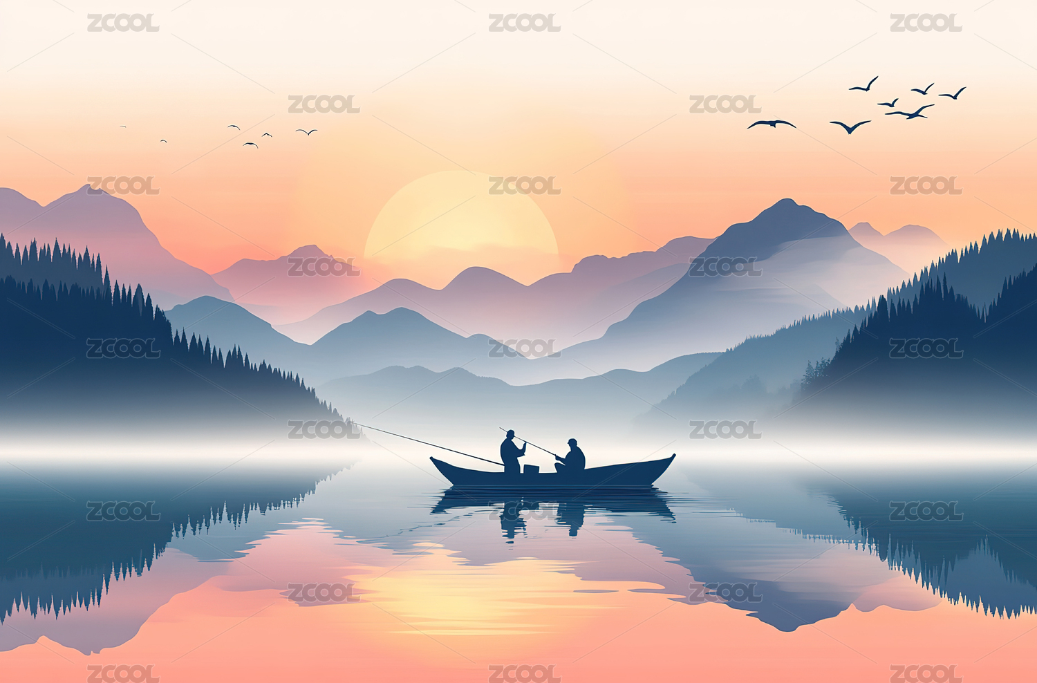 山峦湖泊泛舟垂钓