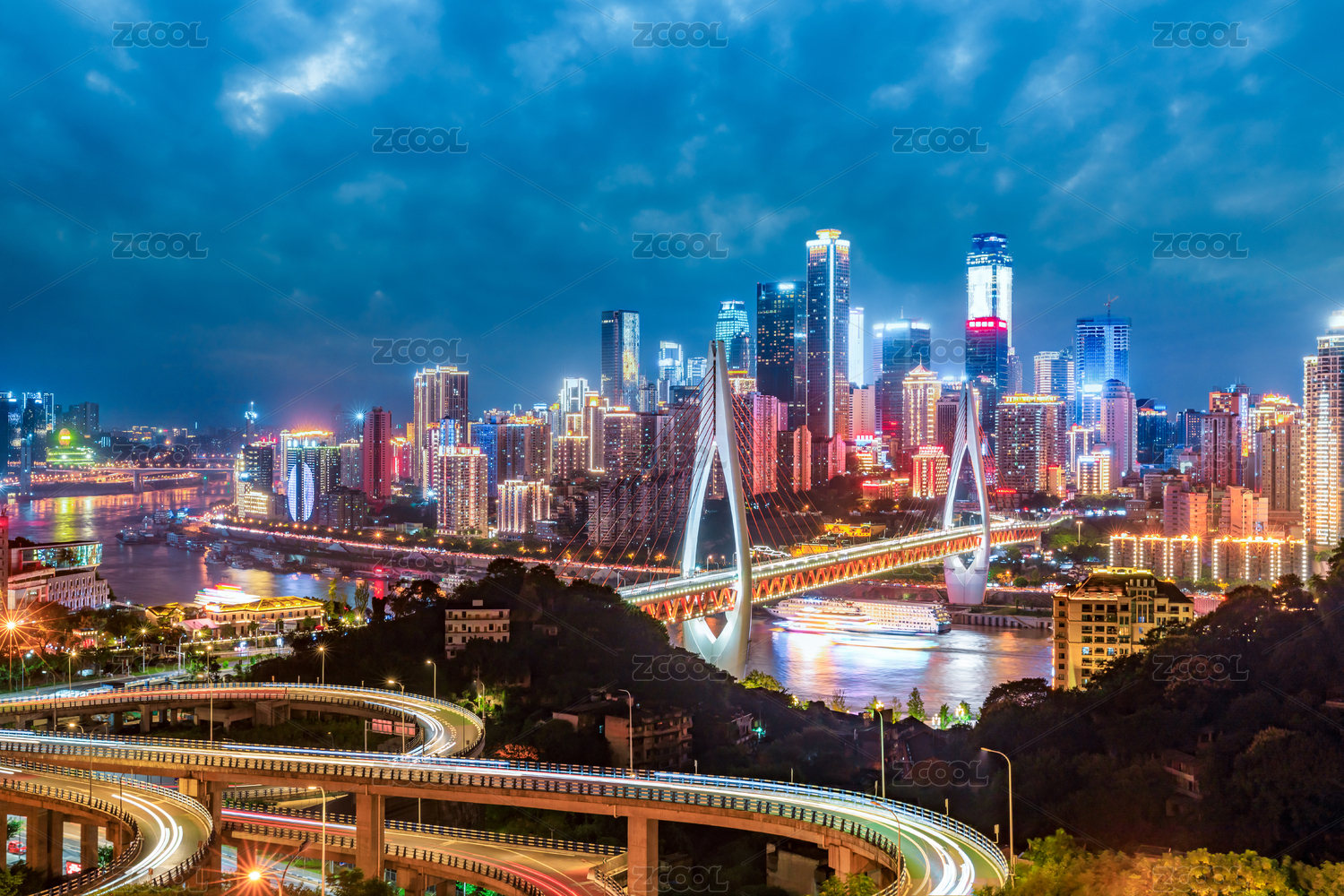 中国重庆市中心建筑河流高架桥道路夜景