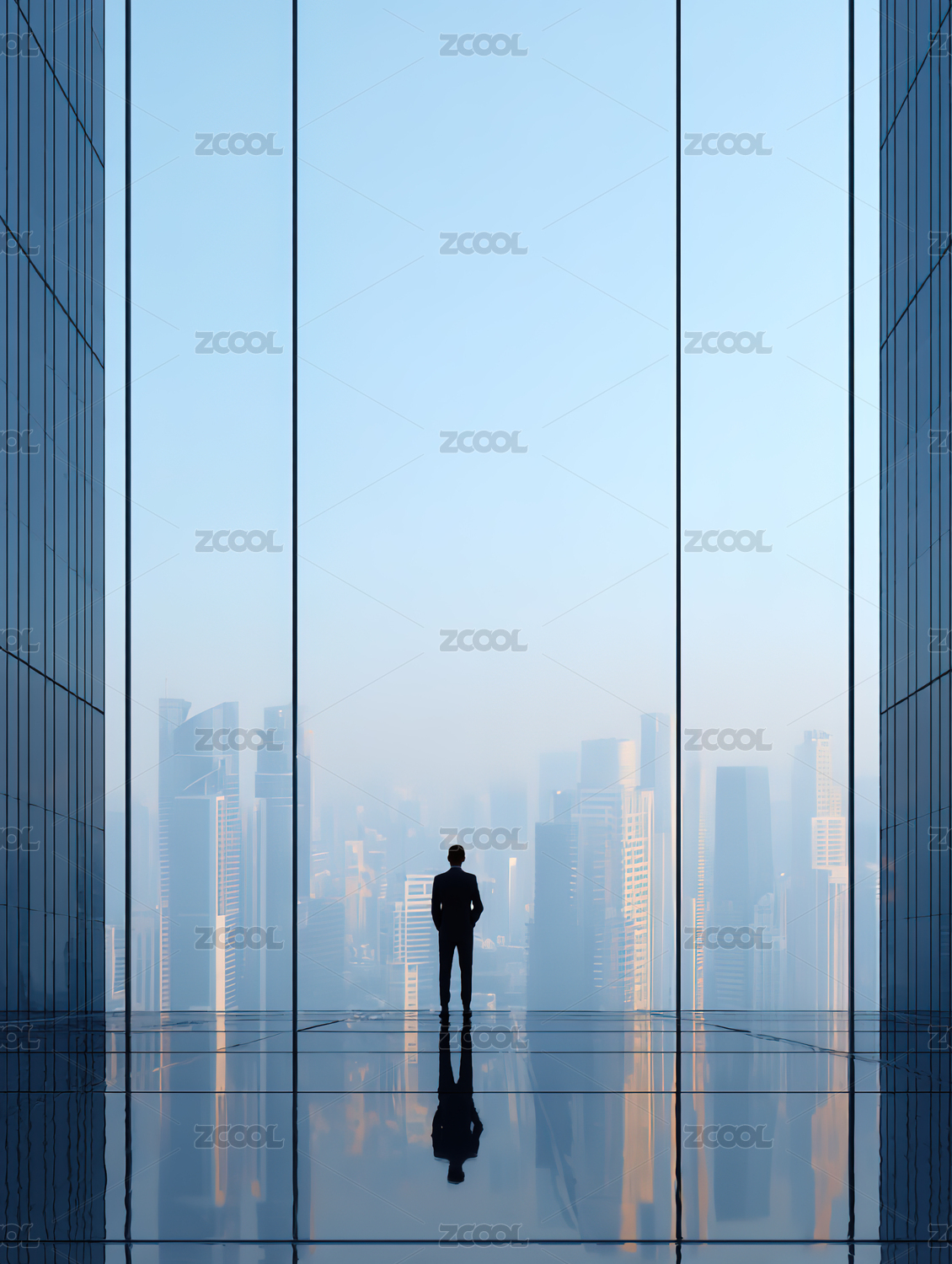 商务人士站在办公楼玻璃幕墙前凝视窗外城市