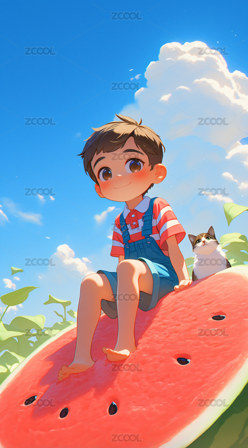 坐在西瓜上的小女孩