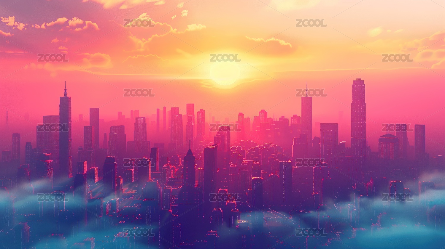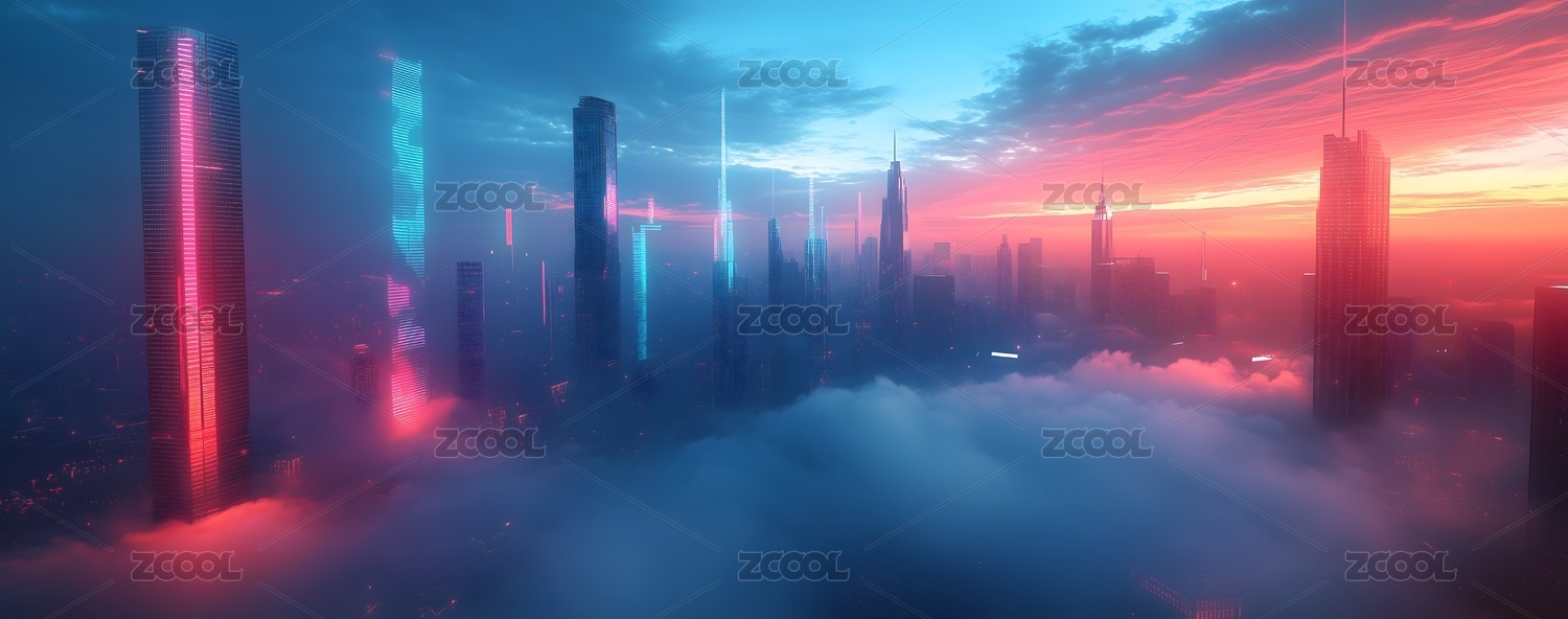 未来都市的日出与云海