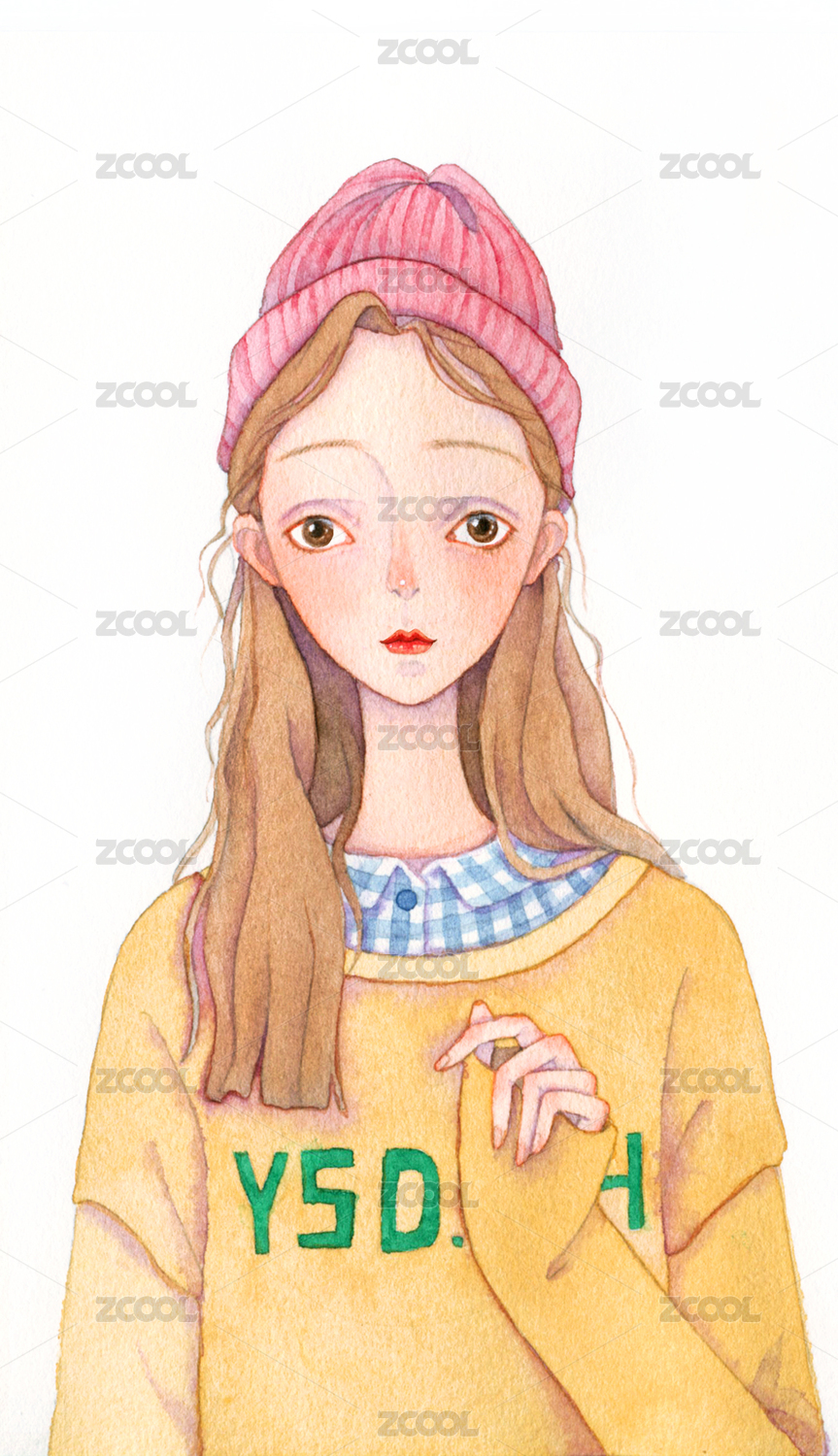 戴着帽子围巾抱着宠物狗的少女 手绘插画