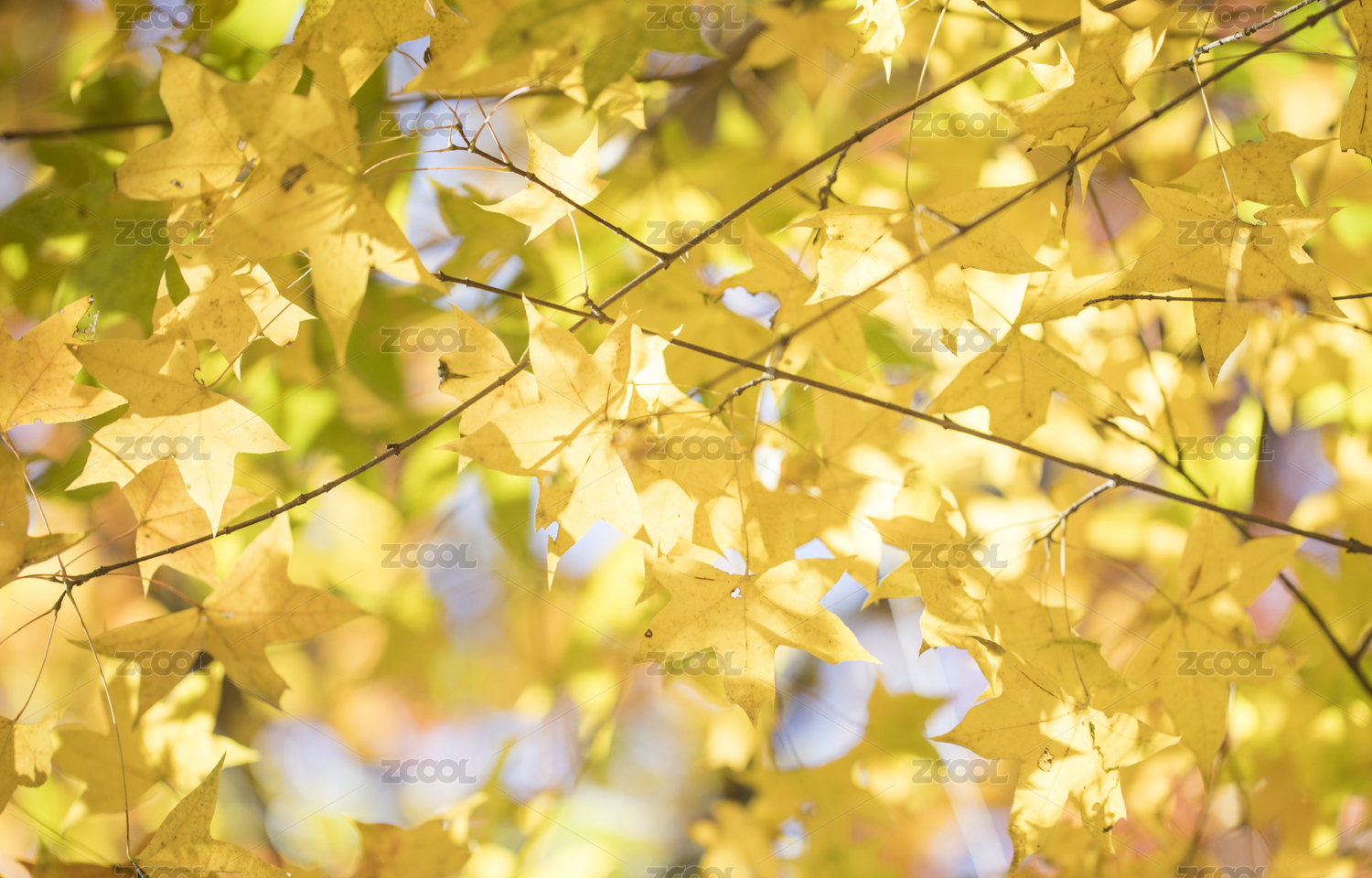 深秋逆光照耀下晶莹剔透的金黄色枫叶
