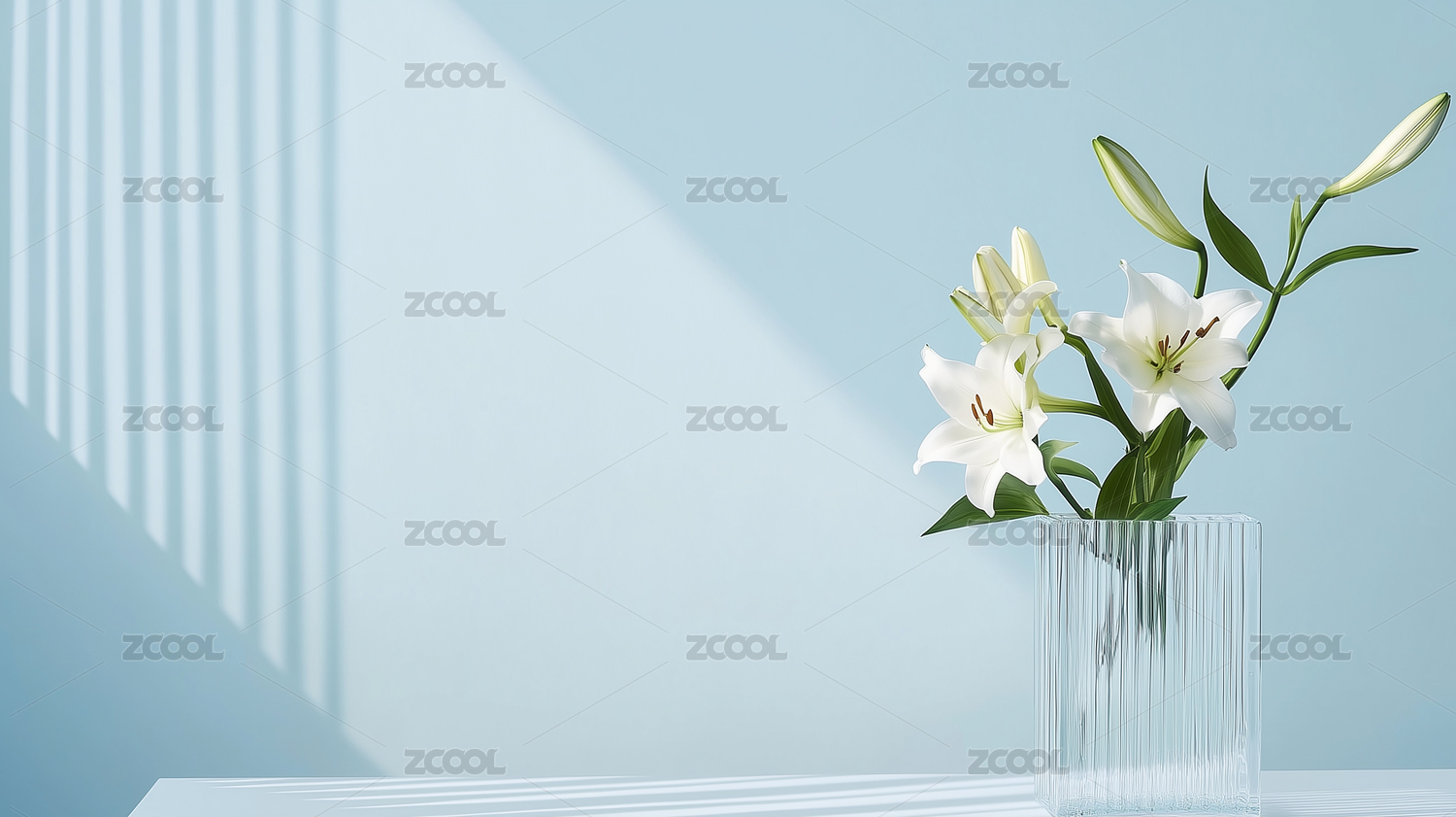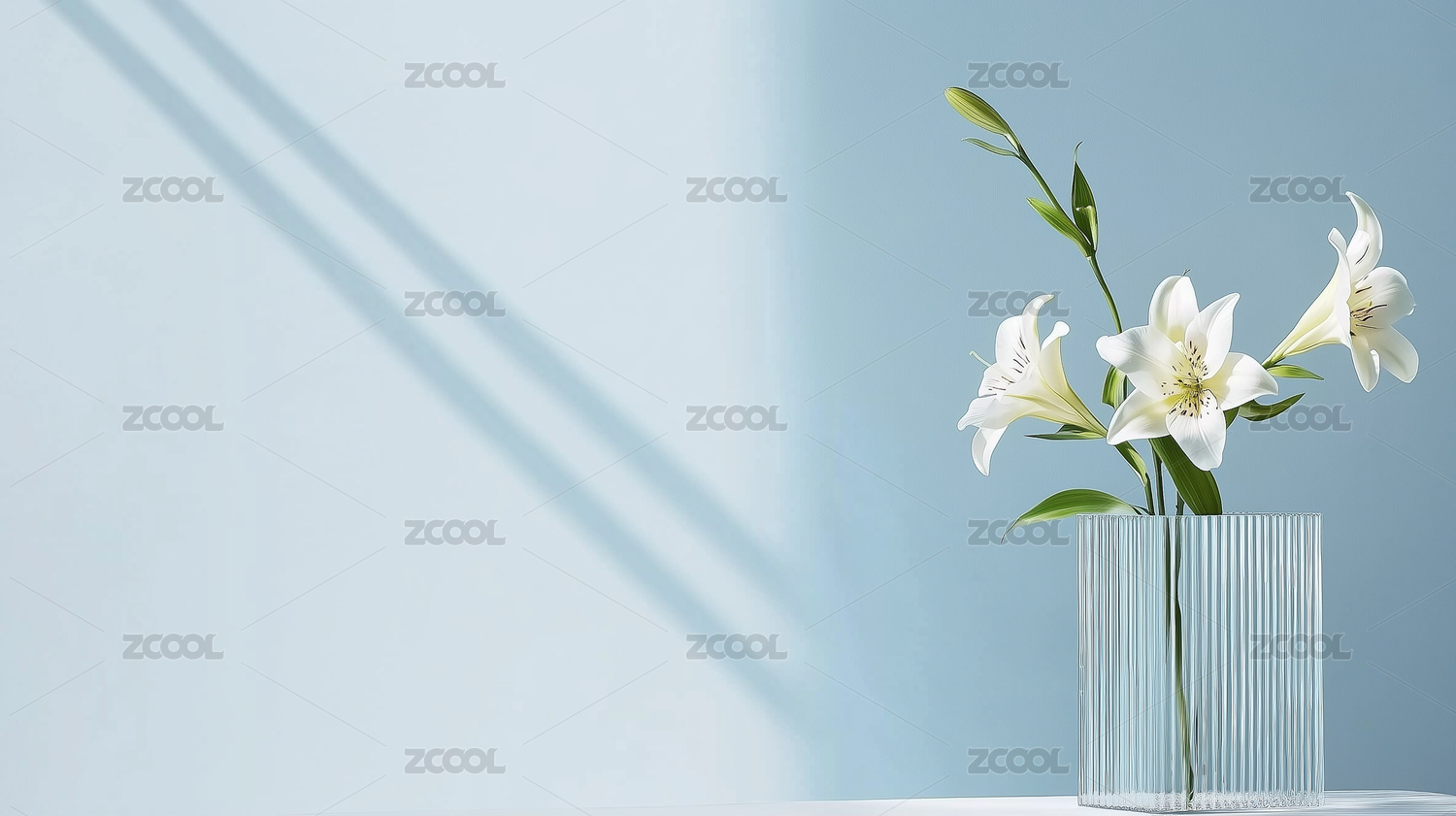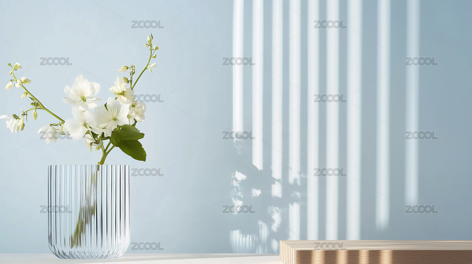 白色,花束,透明,玻璃,花瓶,细长条纹,浅色,台面,淡蓝色,墙壁