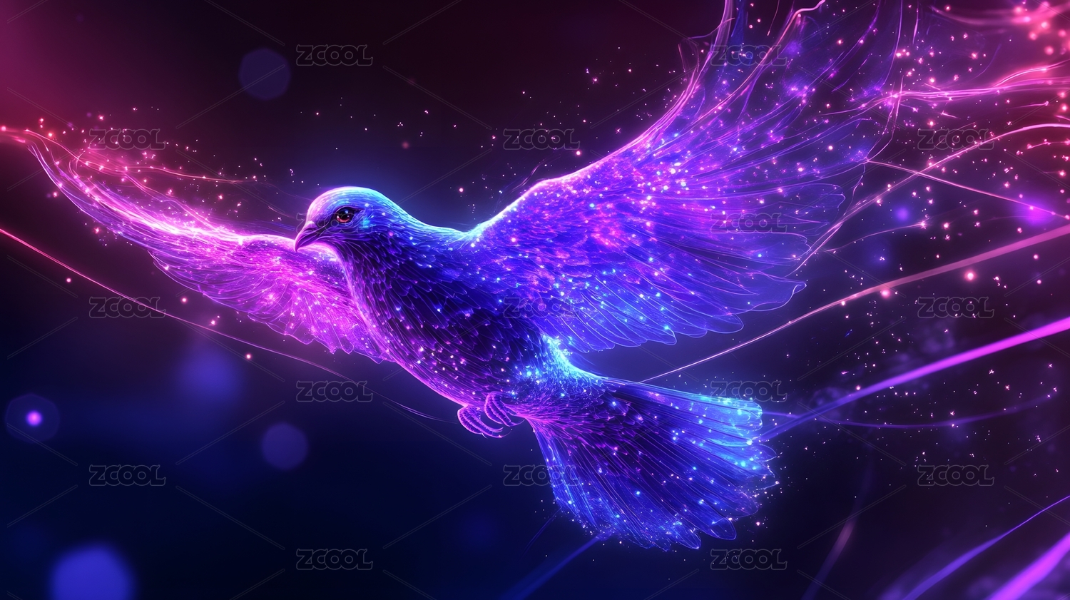 线条,光点构成,飞翔,凤凰,翅膀,波浪状,羽毛,结构,深蓝色,背景