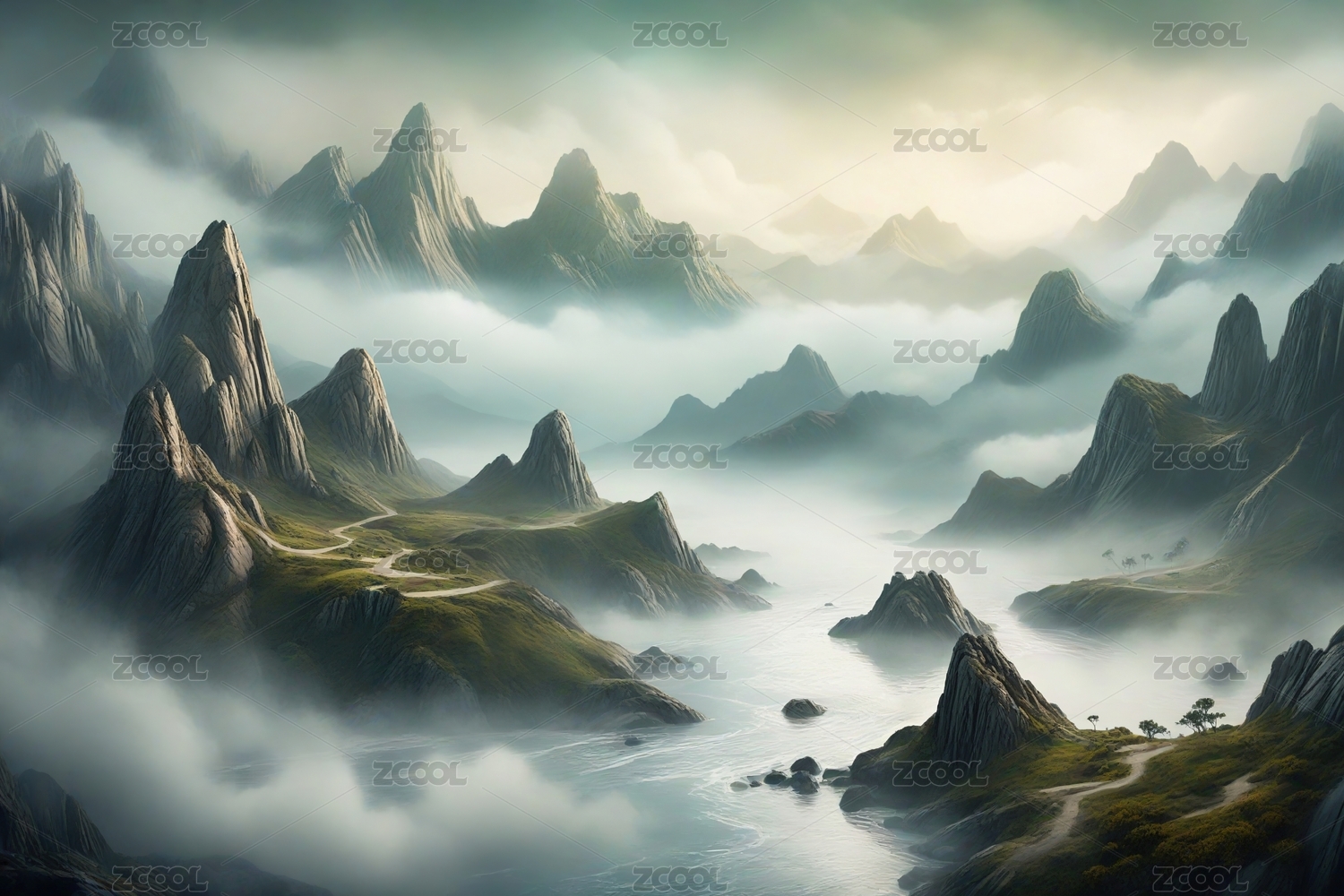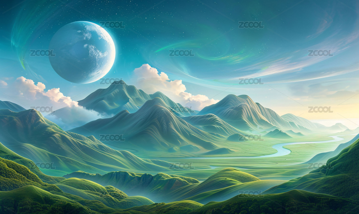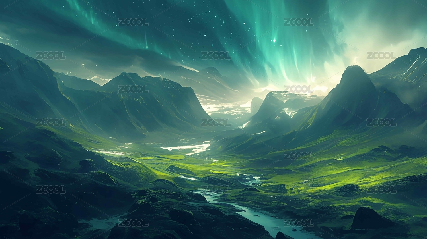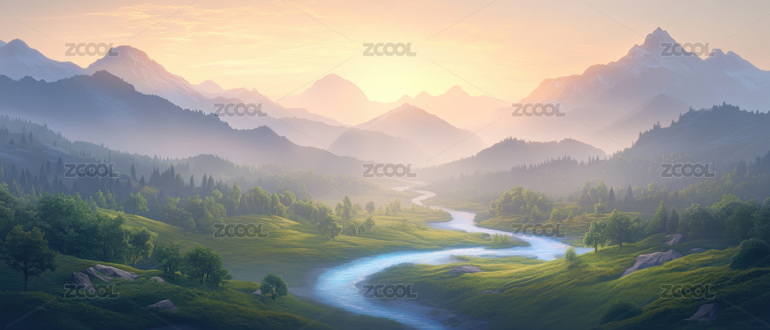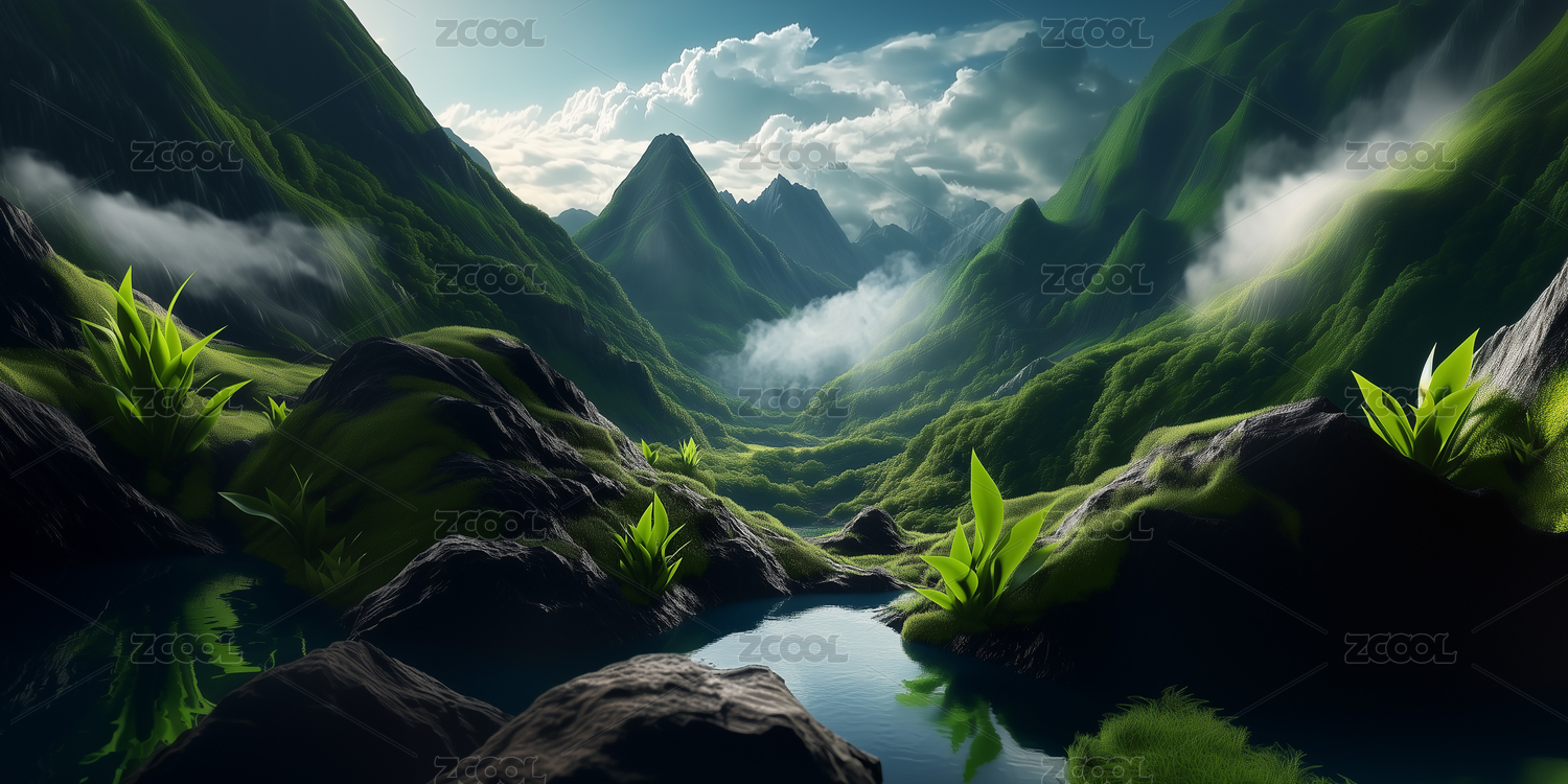 绿地,岩石,树木,雪山,蓝天,白云,清澈溪流,宁静平和,自然风光,美丽景色