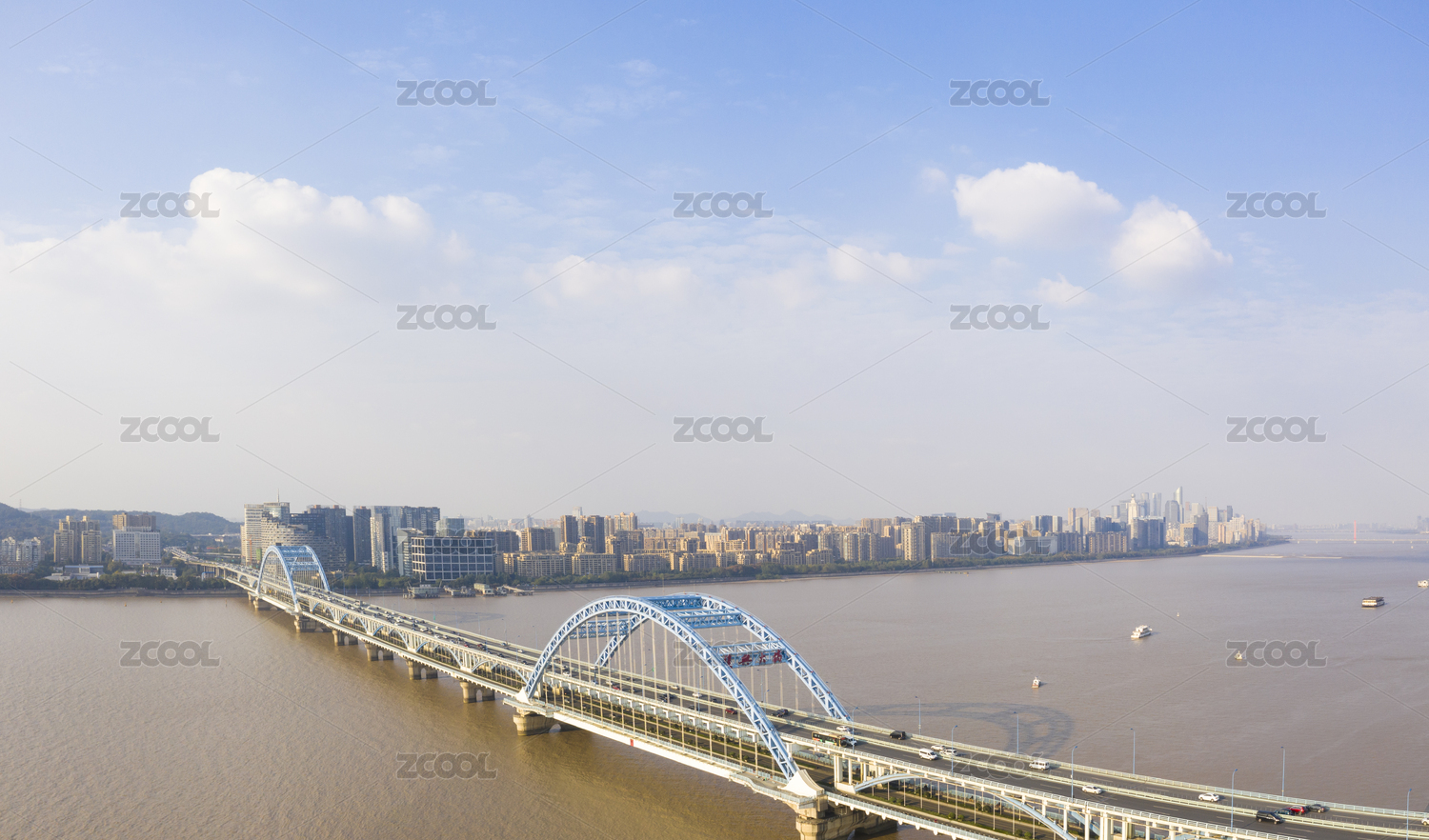杭州钱塘江畔西兴大桥日落傍晚城市建筑风景