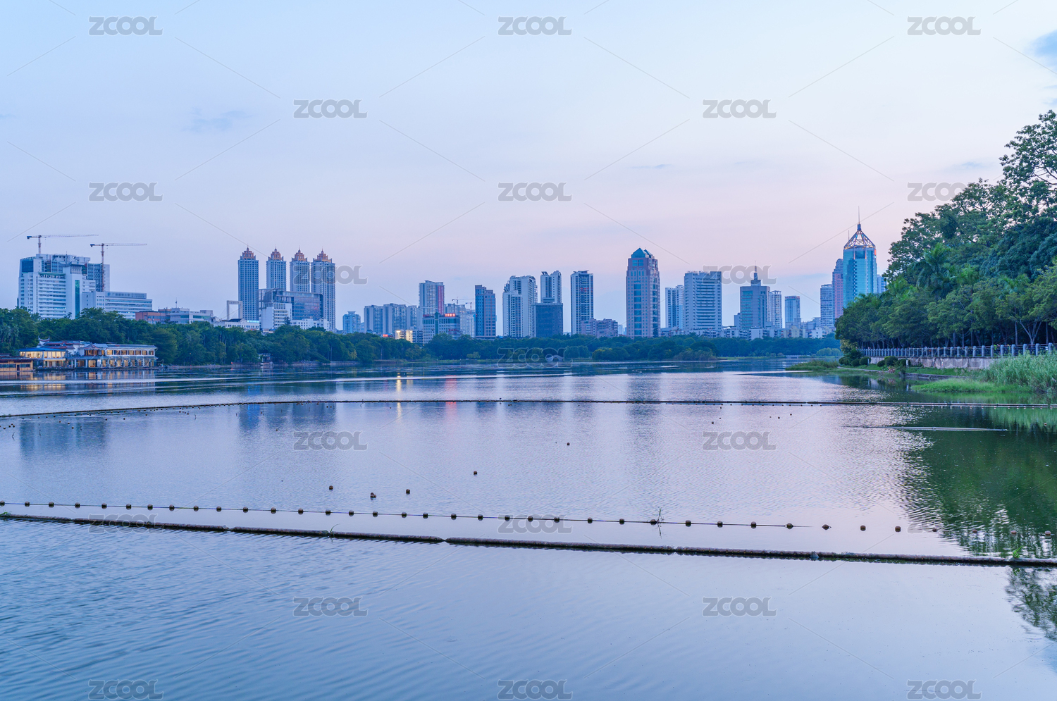 南宁南湖公园夕阳黄昏与城市摩天大楼建筑