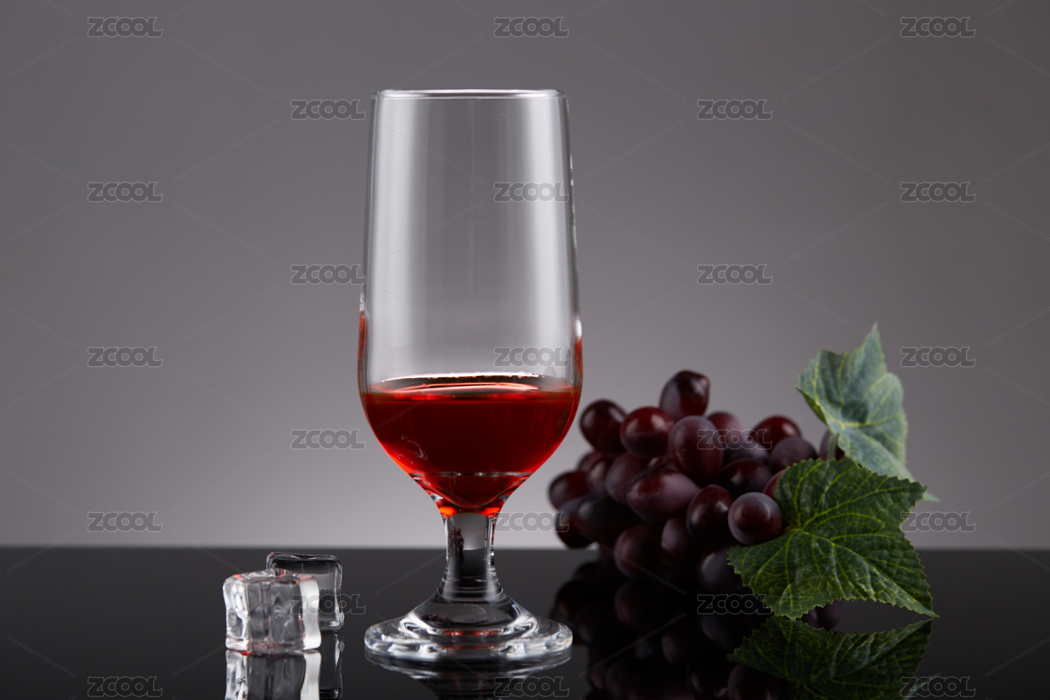 一盘紫色葡萄和一杯红色葡萄酒摆在一起