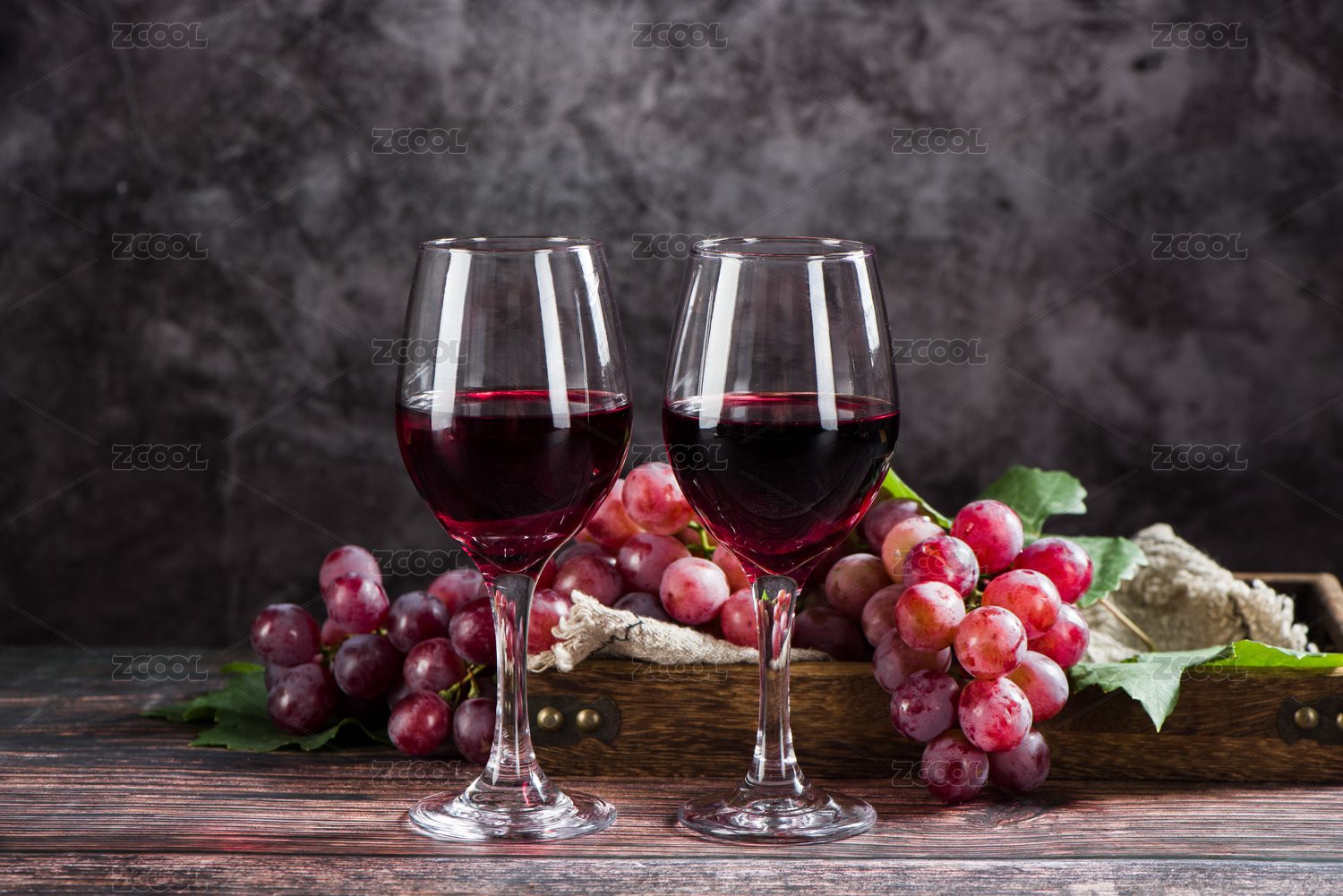 两杯红葡萄酒和新鲜的葡萄在桌子上