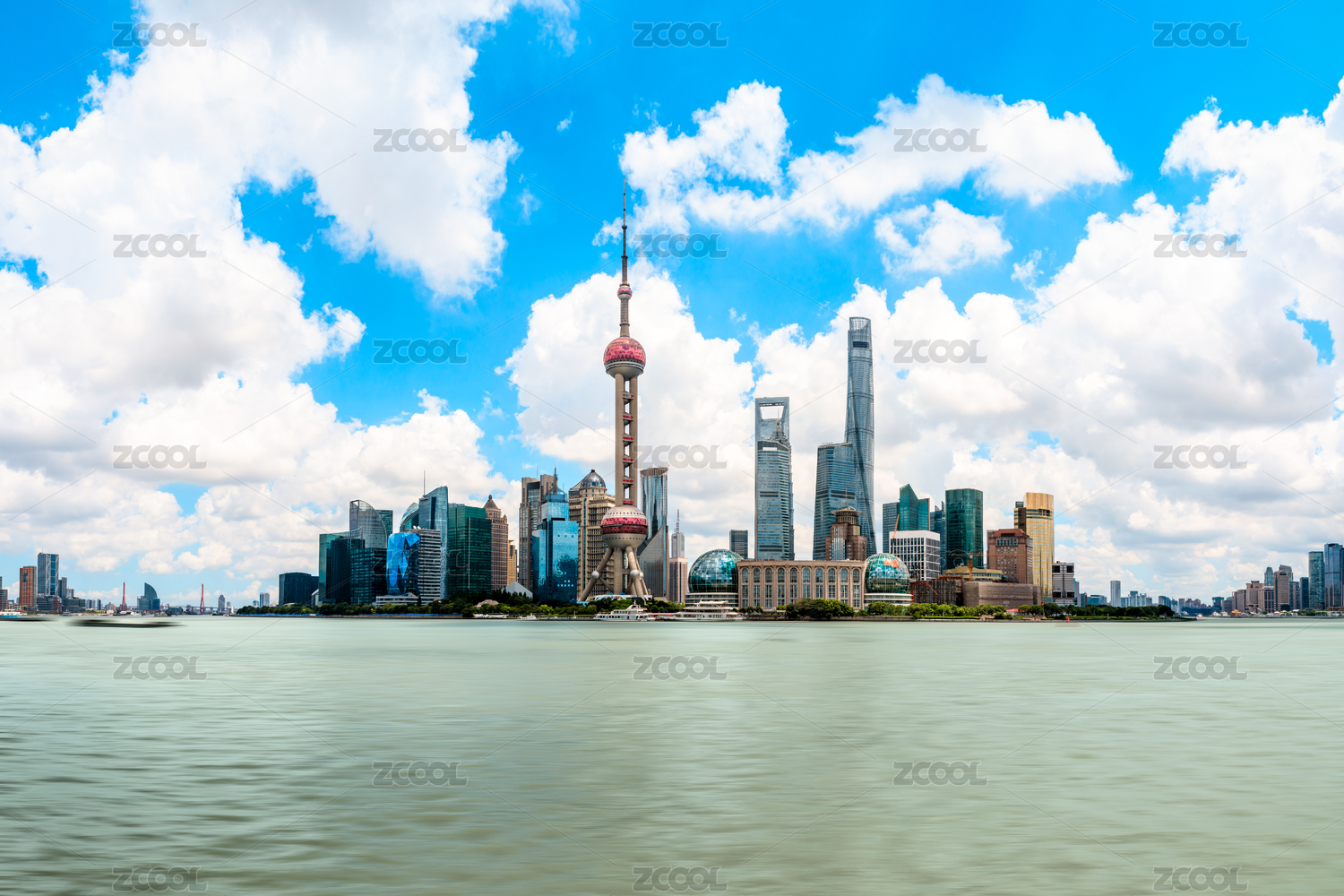上海市中心建筑和黄浦江水面景观在晴朗夏天