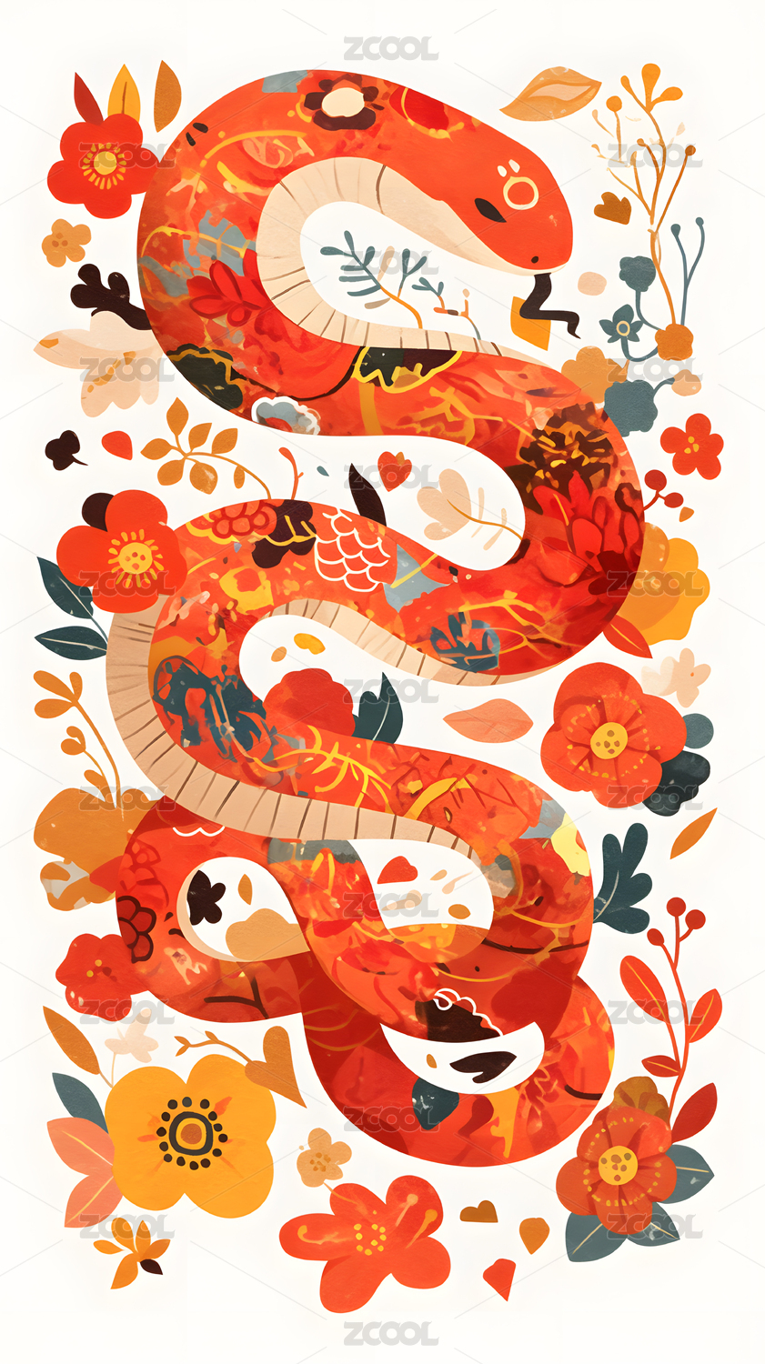 喜庆的复古风格五彩斑斓的蛇和花朵