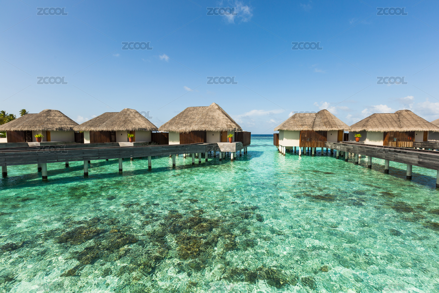 夏天晴朗天气下碧海蓝天的马尔代夫宁静岛度假酒店水屋