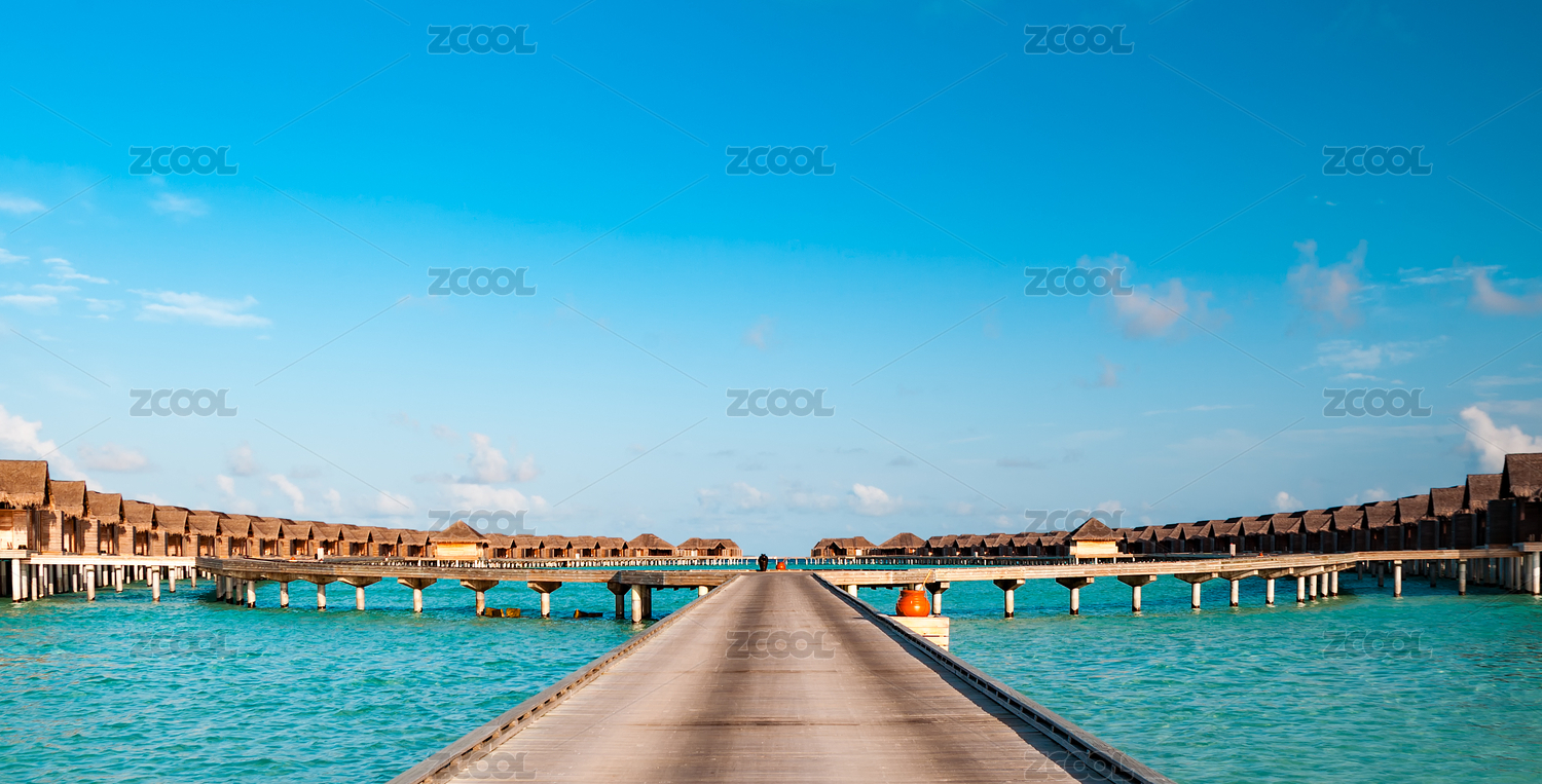 阳光下一条通向马尔代夫海景别墅的木板栈道