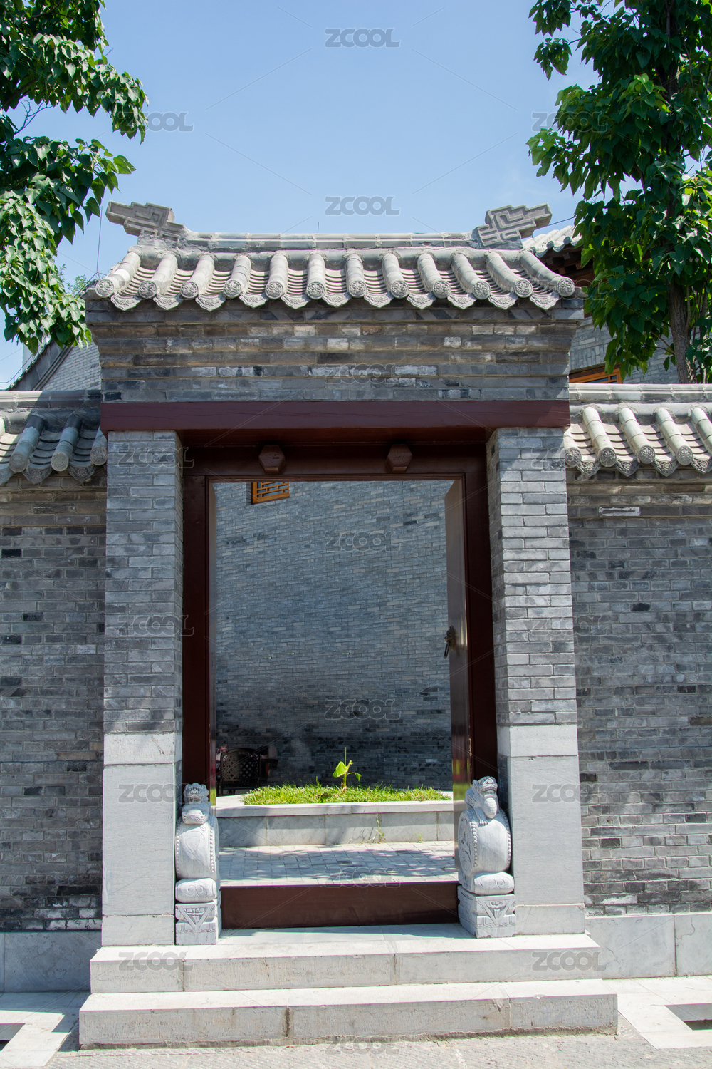 中国古建筑深宅大院孟府大堂东侧巷弄小门屋顶屋檐蓝天