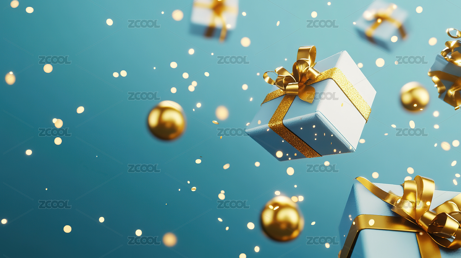 悬浮的金色礼盒和彩色球体
