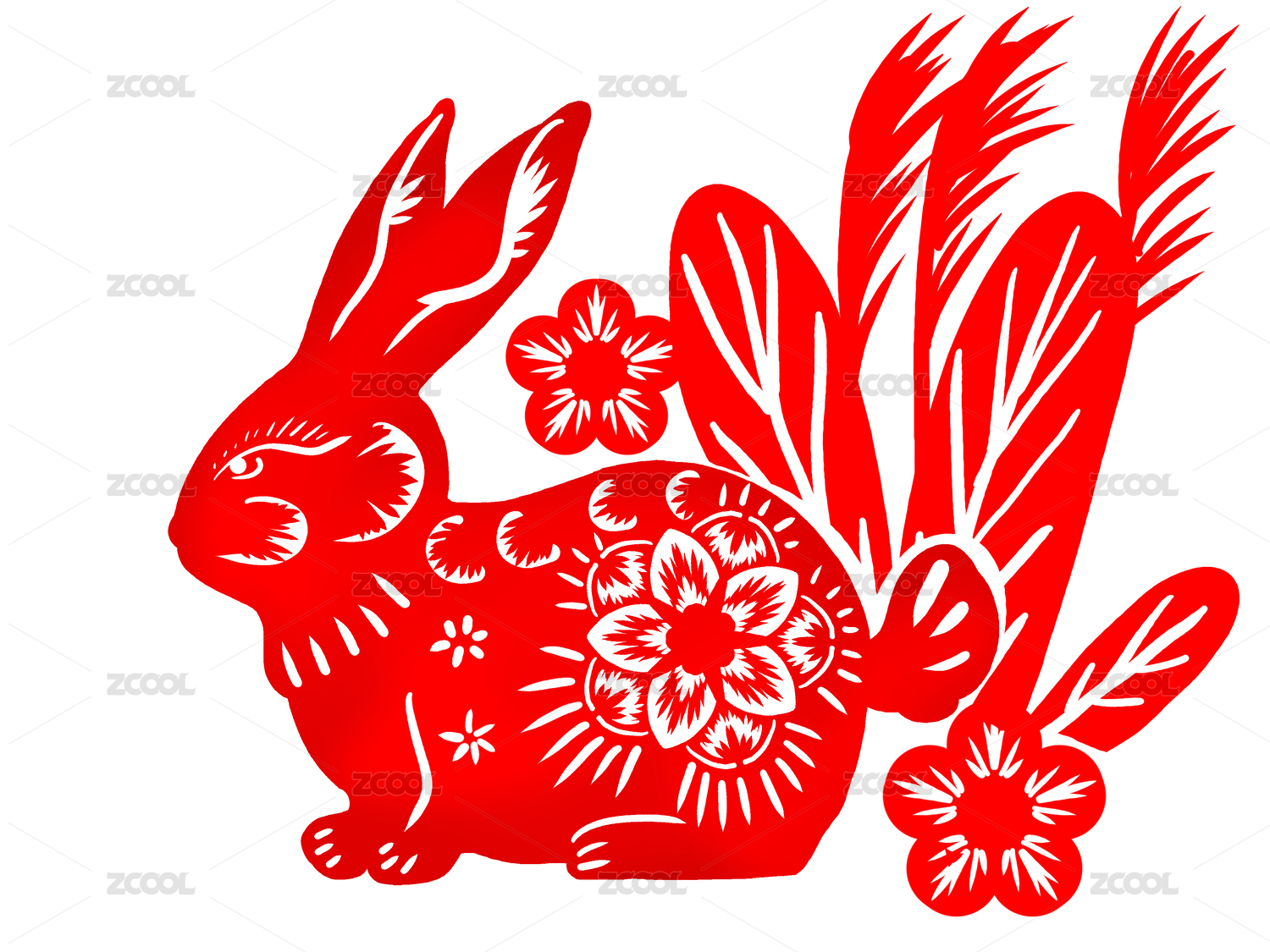 红色兔年剪纸趴着的小兔花朵图案梅花芦苇