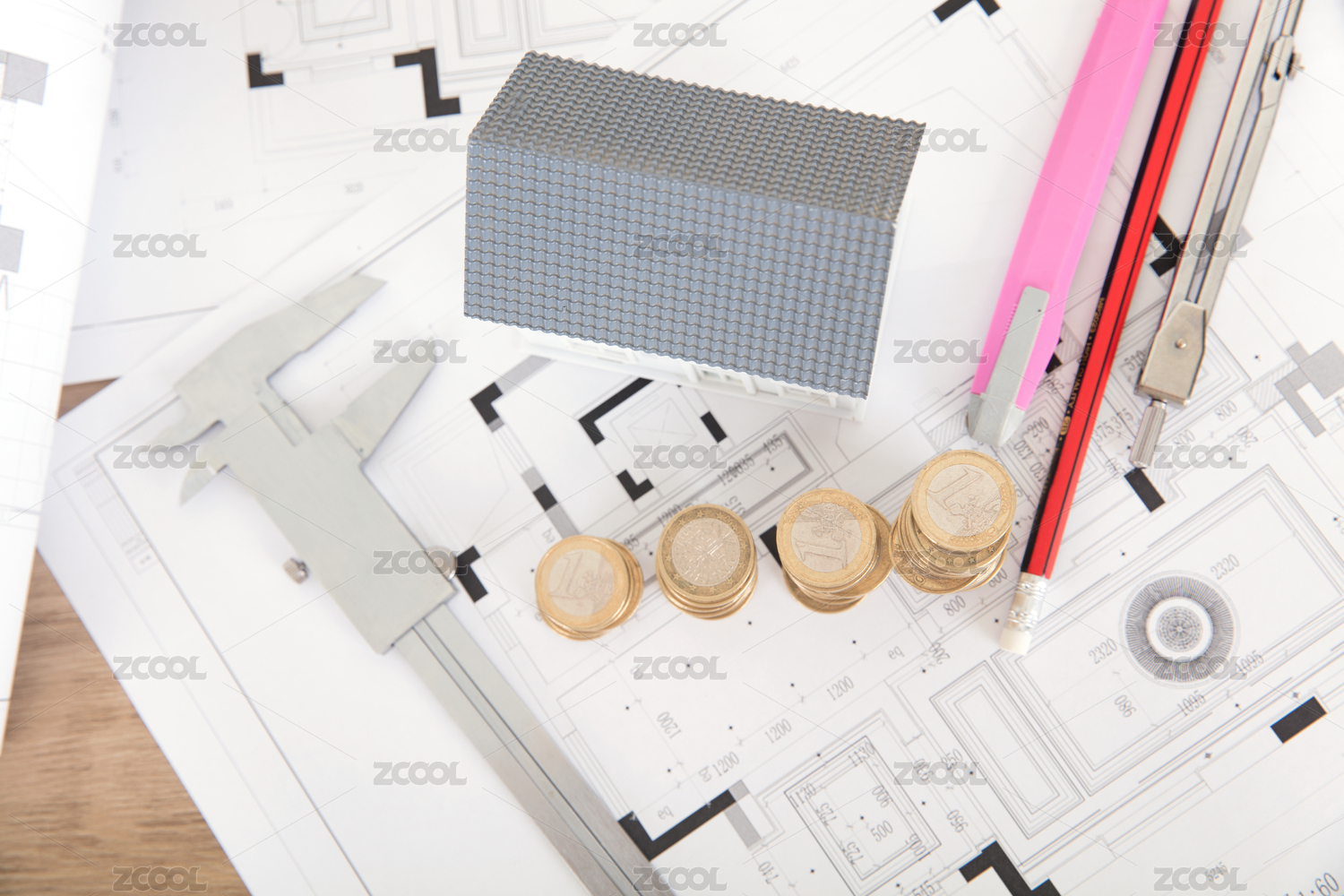 桌子上的图纸和图纸上的小房子模型及一排欧元硬币和相关工具