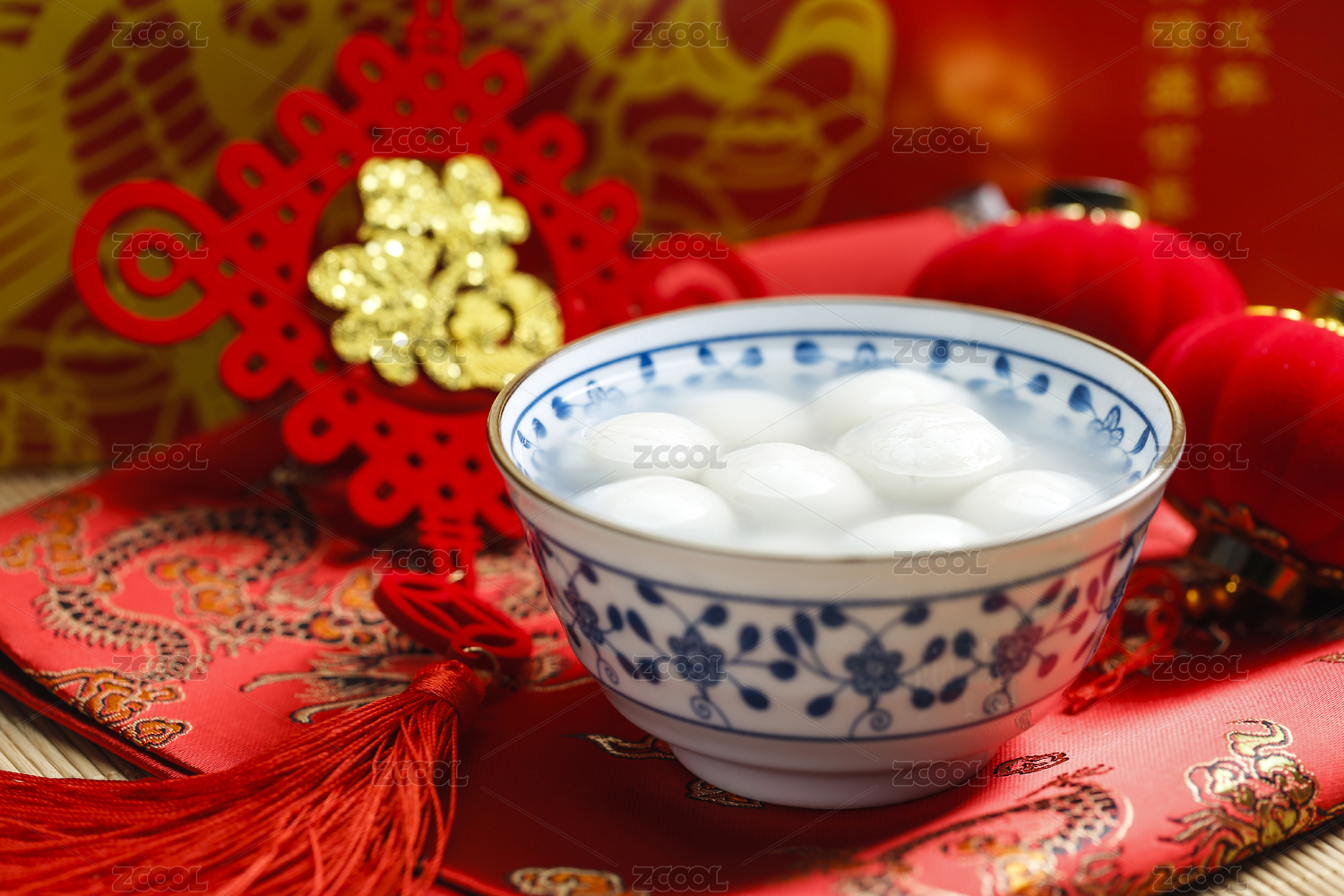 中国元宵节美食汤圆和如意结在洒金红纸背景上
