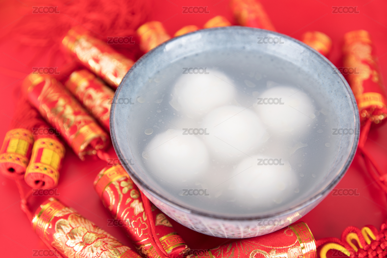 鞭炮装饰里的一碗汤圆食品